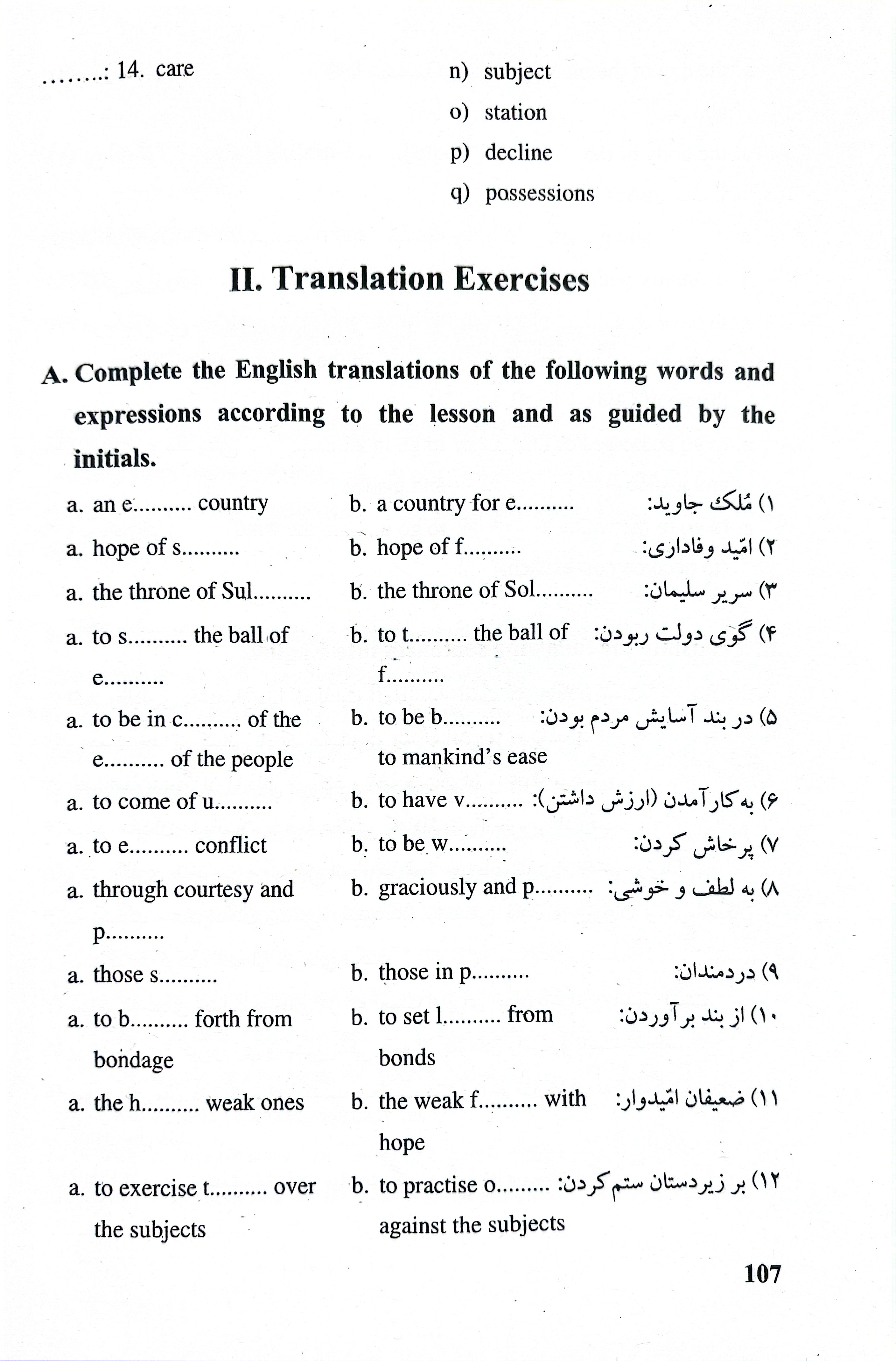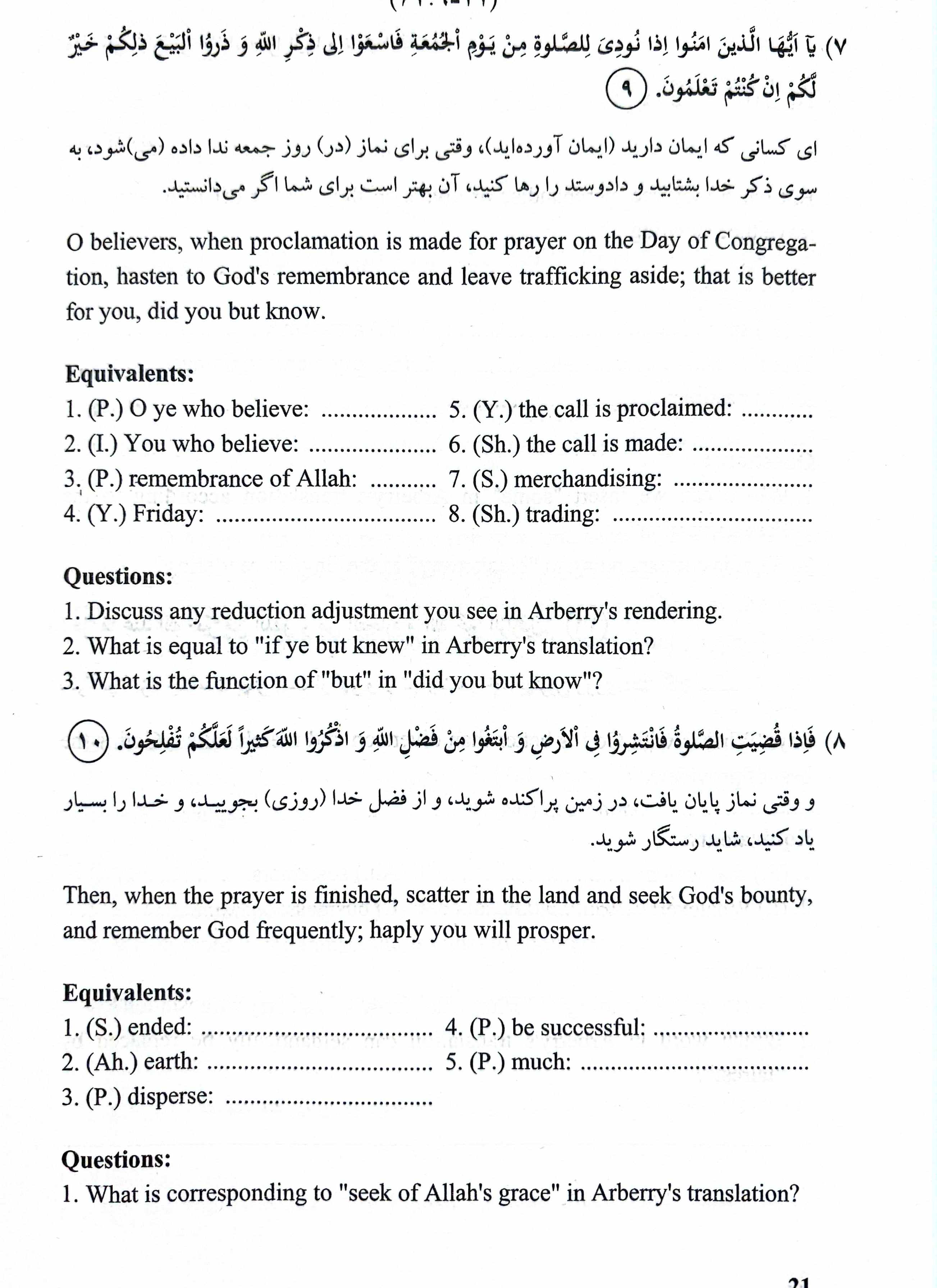 قرار میگیرد تا دانشجو بتواند آنها را مقایسه کند. بعد از آن، معادلهای مهم، نکات تحلیلی و تمرینهای ترجمه