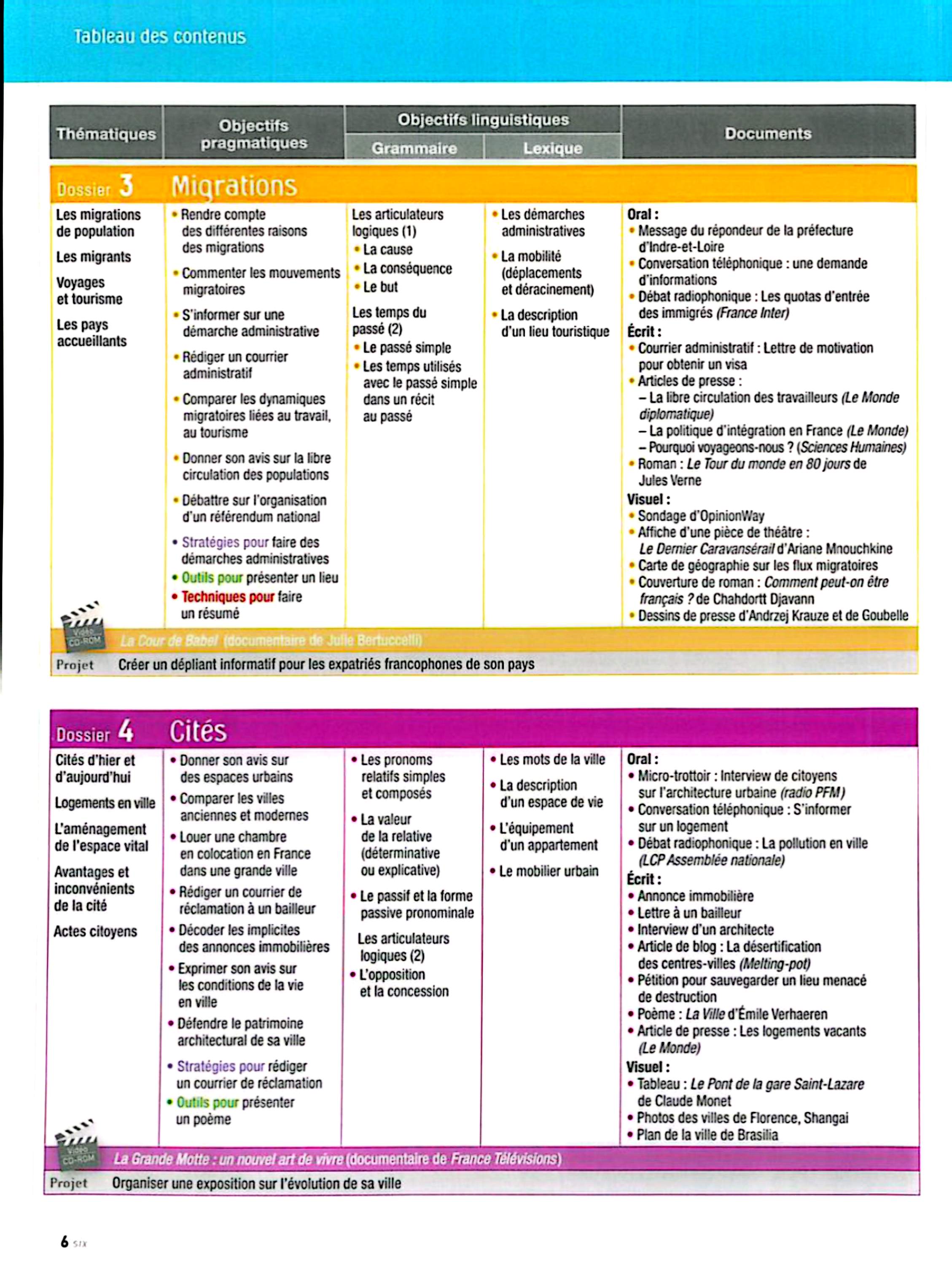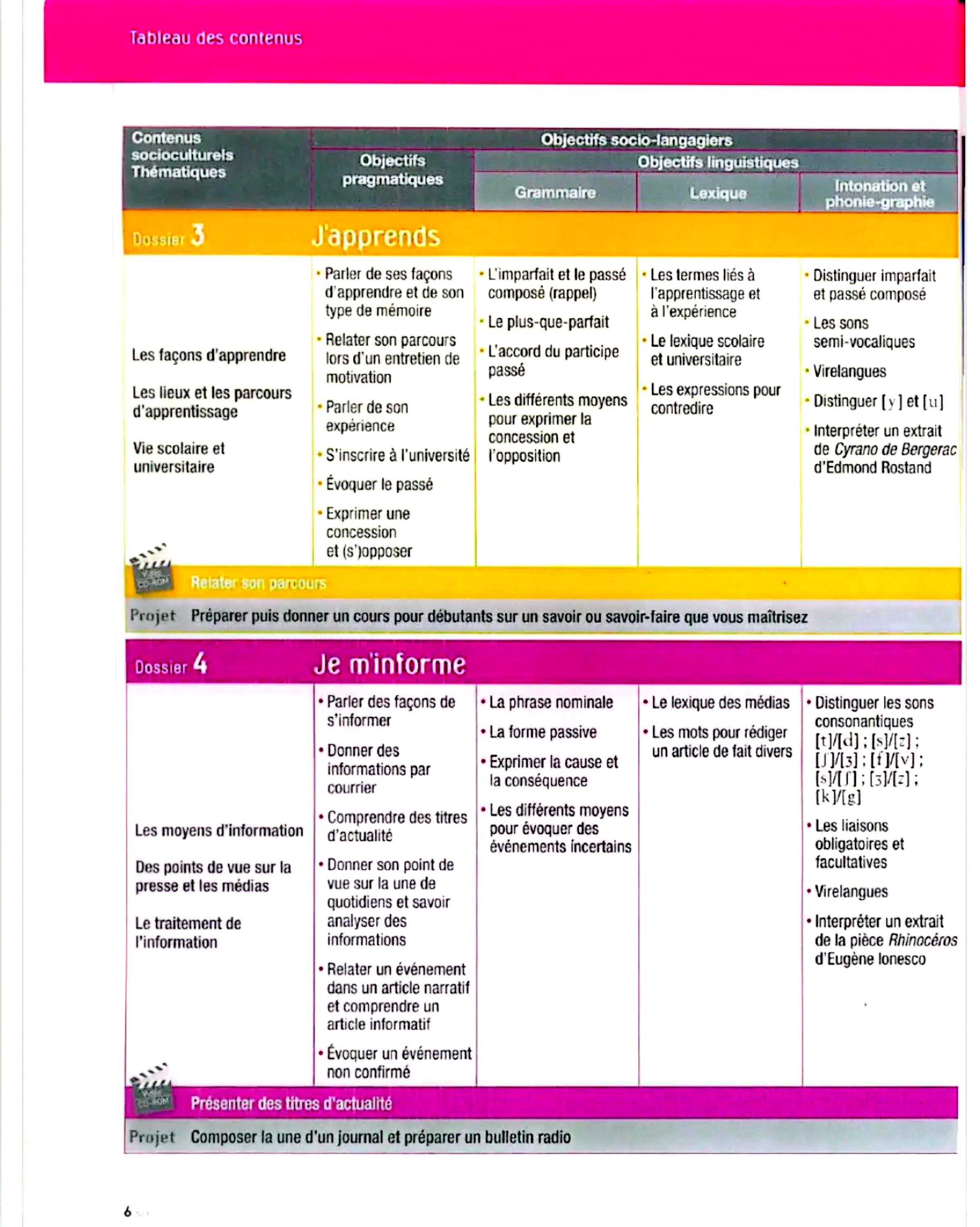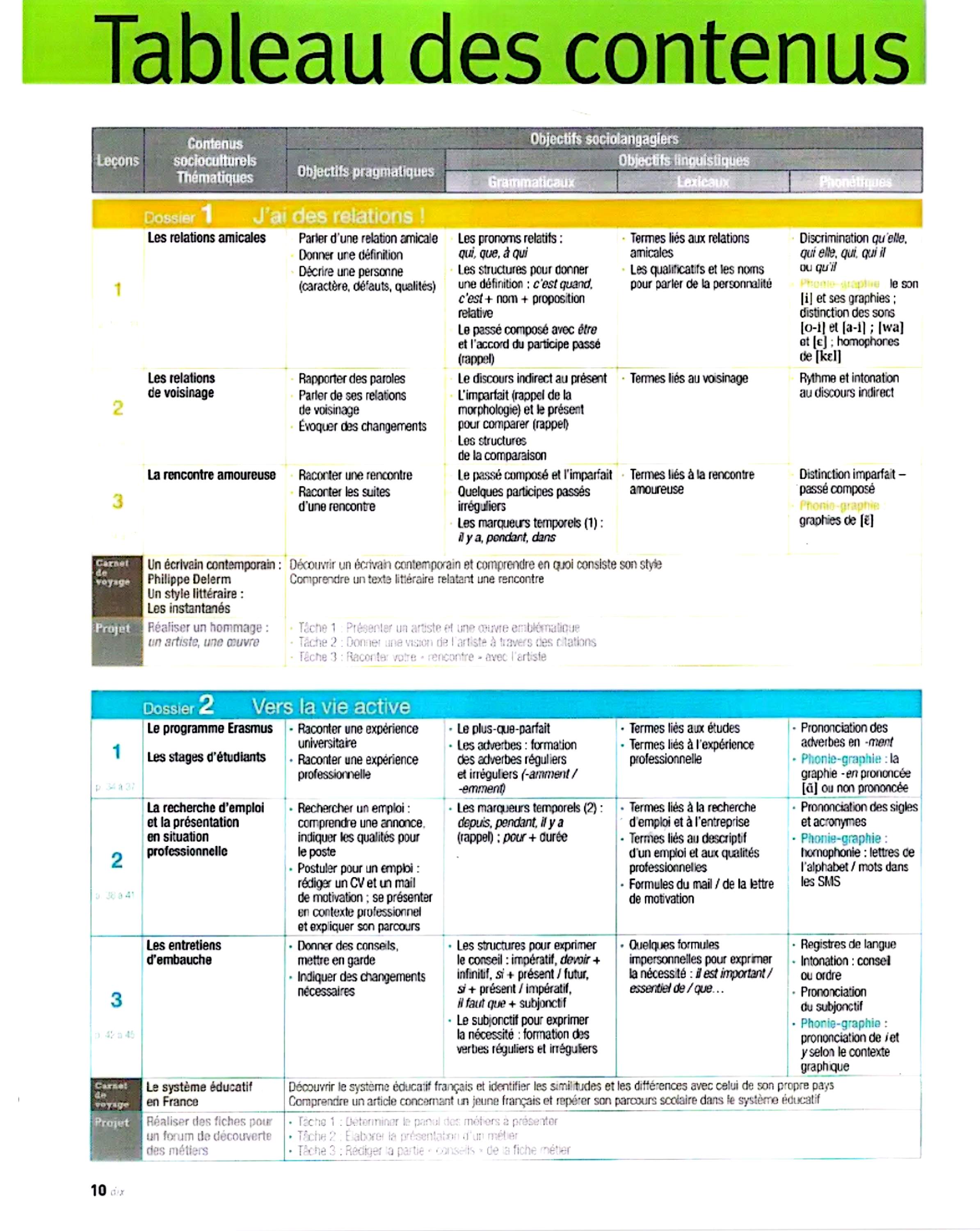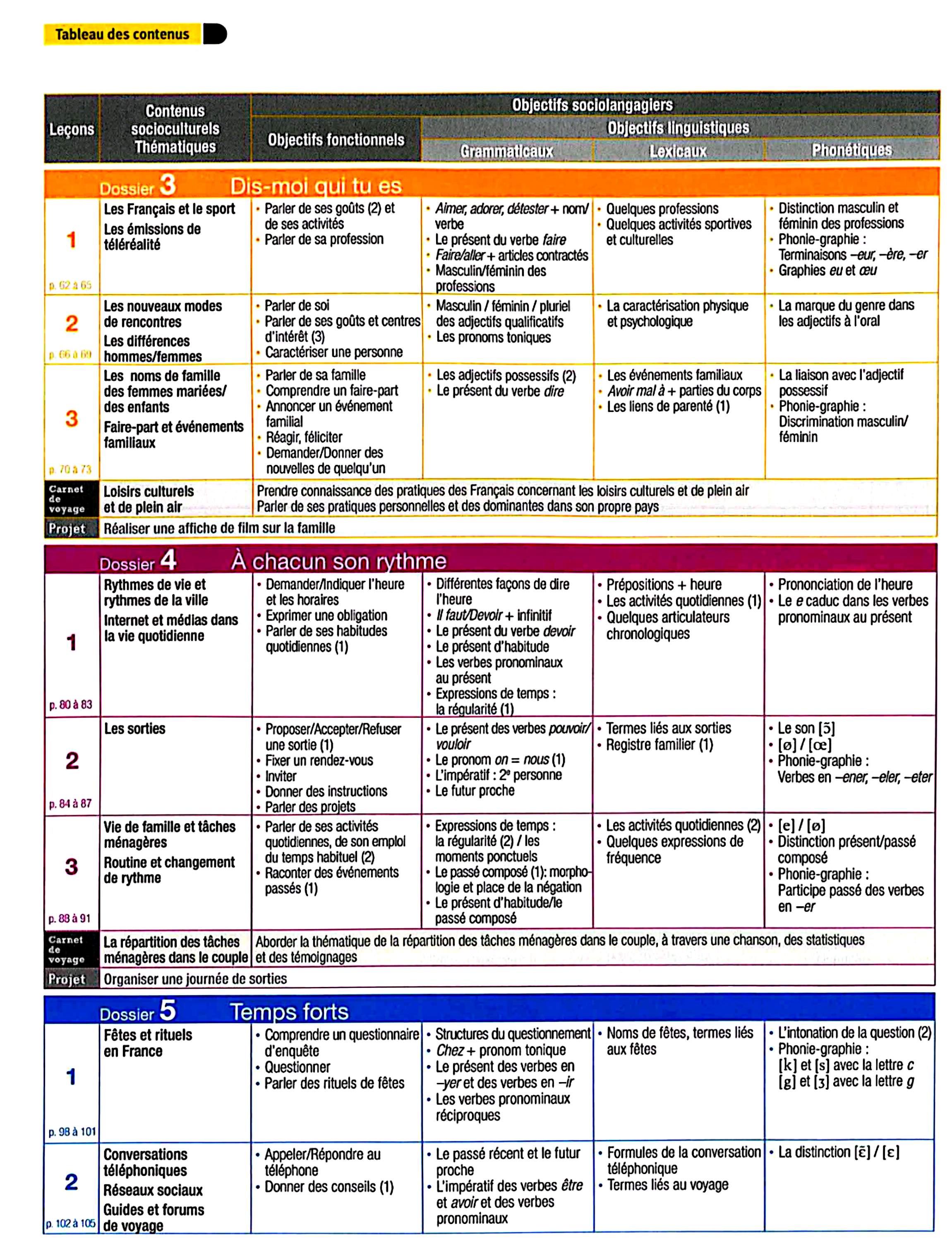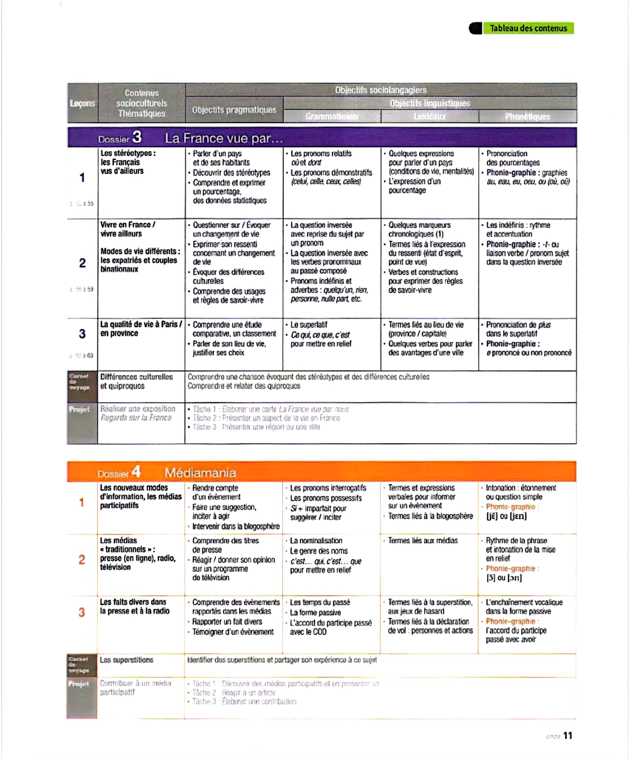 در این جلد ساختارهایی مانند ضمیرهای موصولی qui و que و à qui، گزارش غیرمستقیم، گذشته مرکب و ناقص، plus-que-parfait، ضمیرهای اشاره، ساختارهای توصیه و ضرورت، si + présent / impératif، ساختارهای بیان زمان، مقایسه و شکل مجهول آموزش داده میشود. همچنین واژگان مربوط به روابط، شخصیت، همسایگی، کار و استخدام، زندگی روزمره، تفاوتهای فرهنگی، رسانهها و روایت خبرها تمرین میشود.