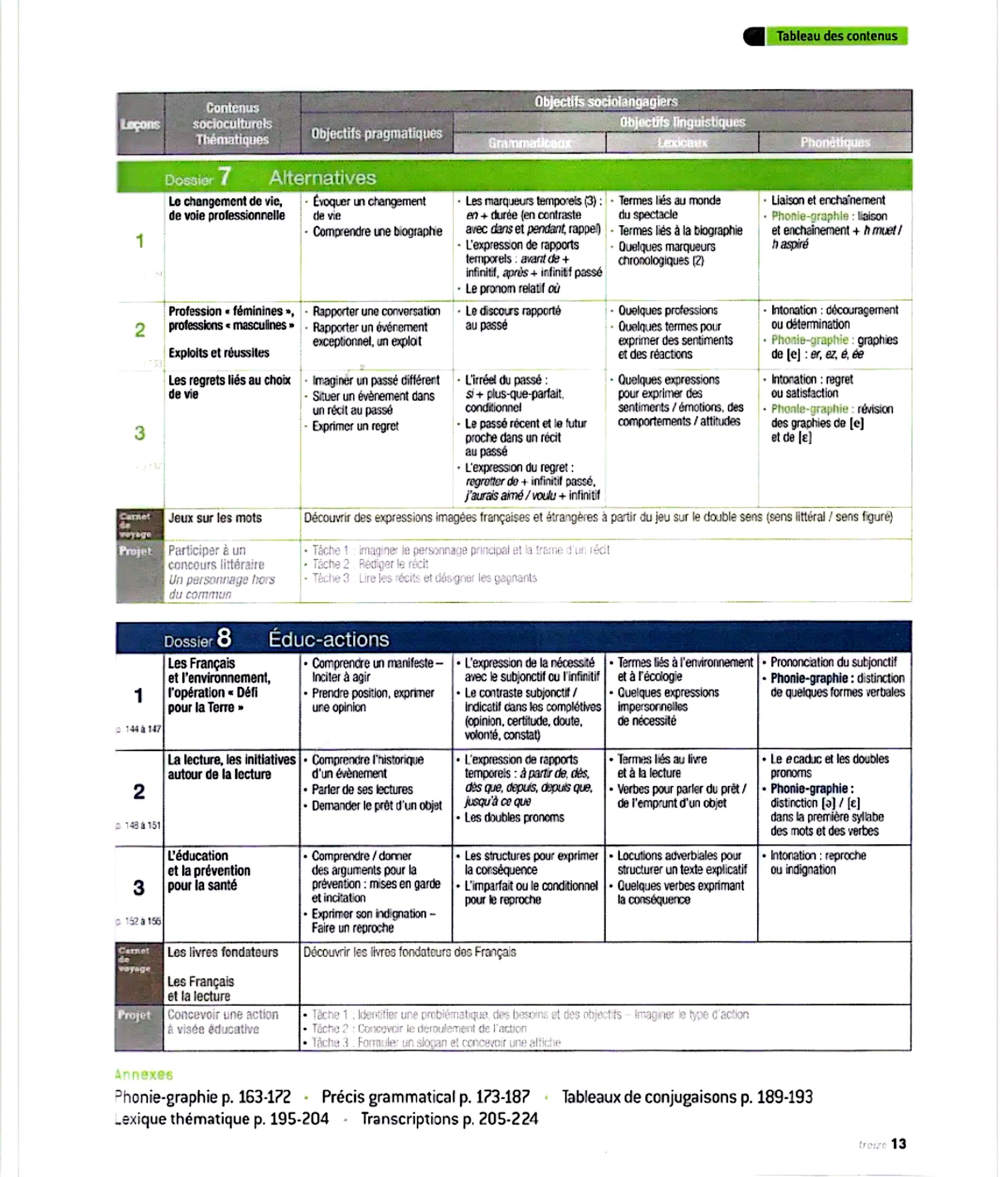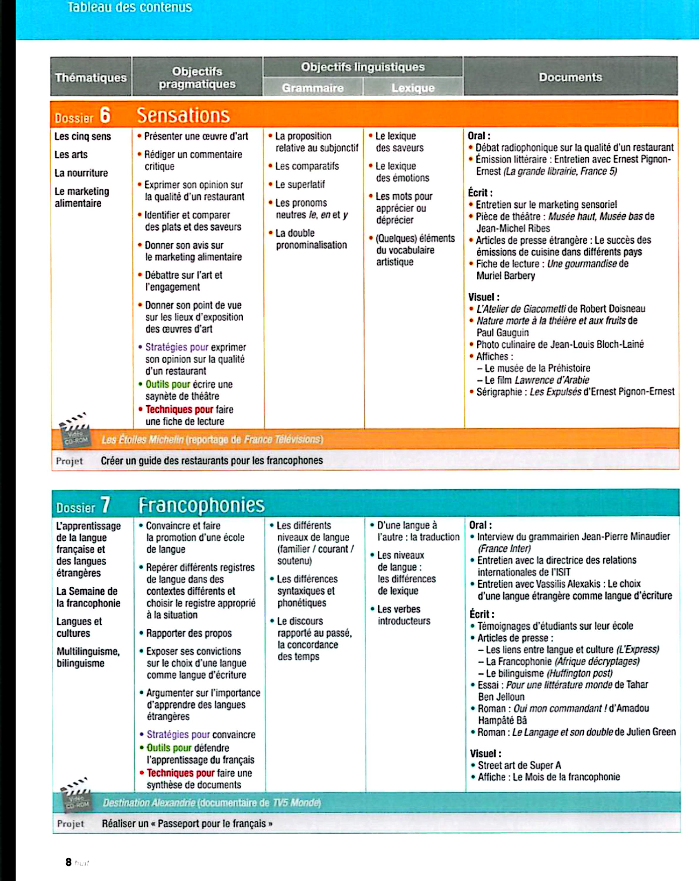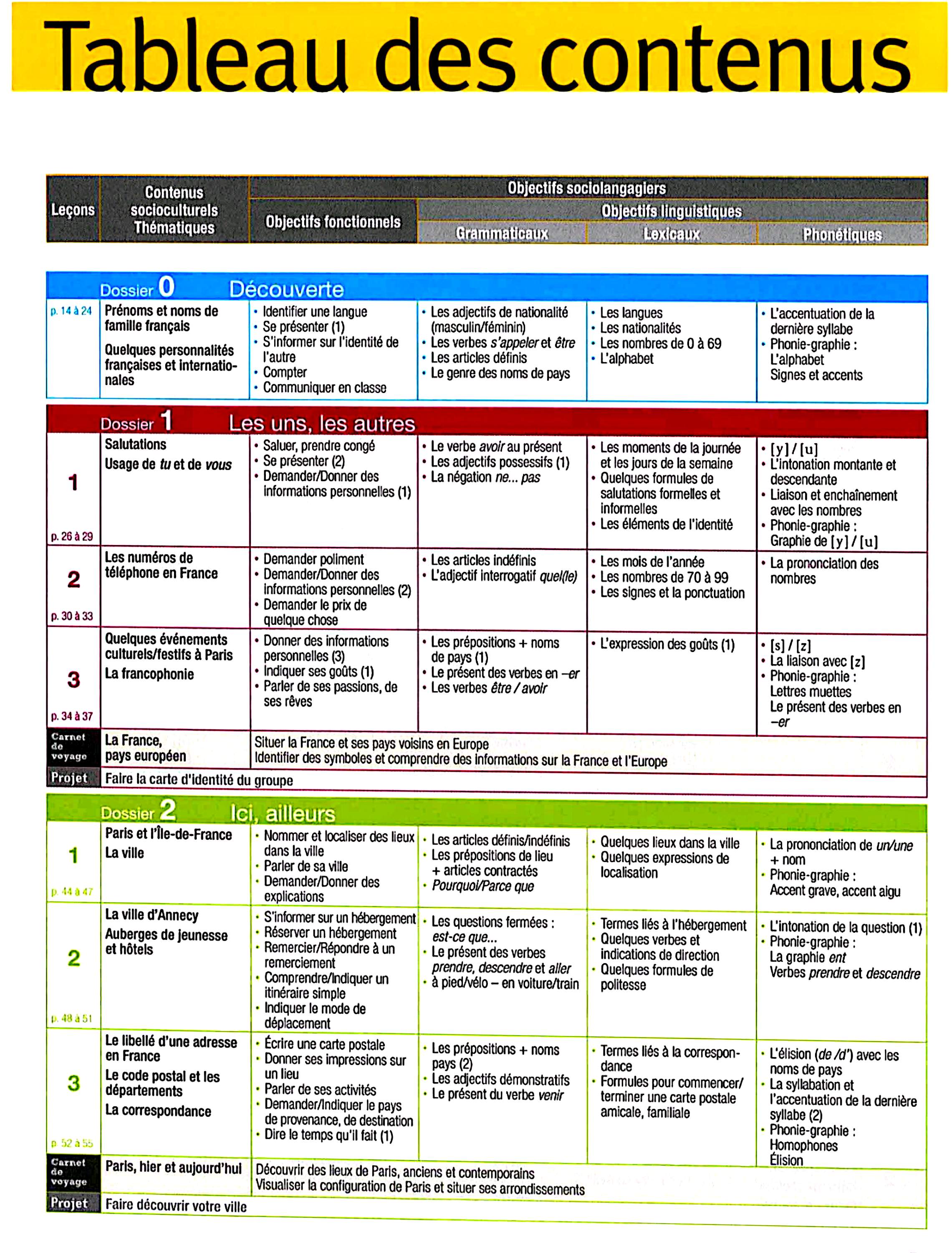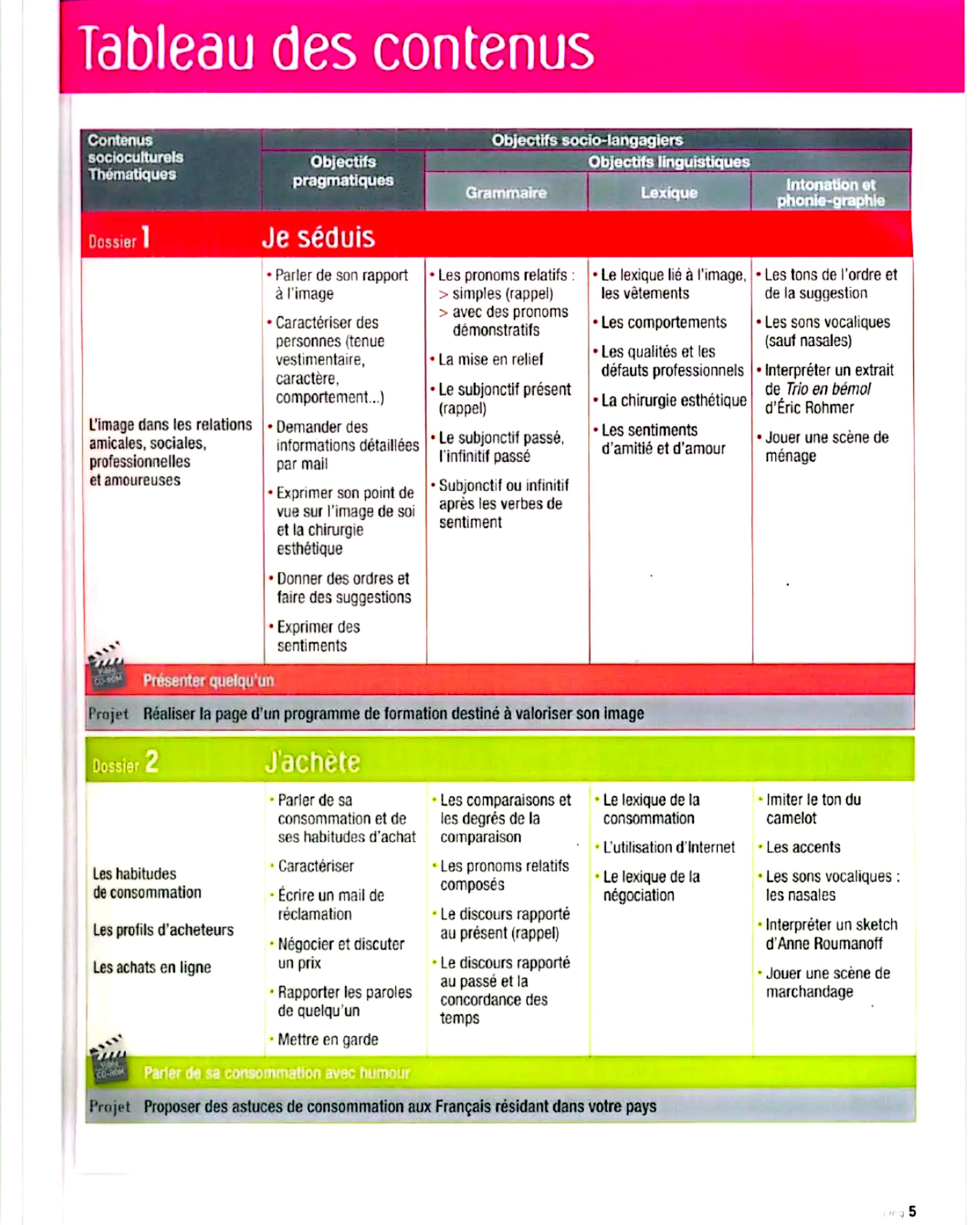در این جلد ساختارهایی مانند ضمیرهای موصولی qui و que و à qui، گزارش غیرمستقیم، گذشته مرکب و ناقص، plus-que-parfait، ضمیرهای اشاره، ساختارهای توصیه و ضرورت، si + présent / impératif، ساختارهای بیان زمان، مقایسه و شکل مجهول آموزش داده میشود. همچنین واژگان مربوط به روابط، شخصیت، همسایگی، کار و استخدام، زندگی روزمره، تفاوتهای فرهنگی، رسانهها و روایت خبرها تمرین میشود.