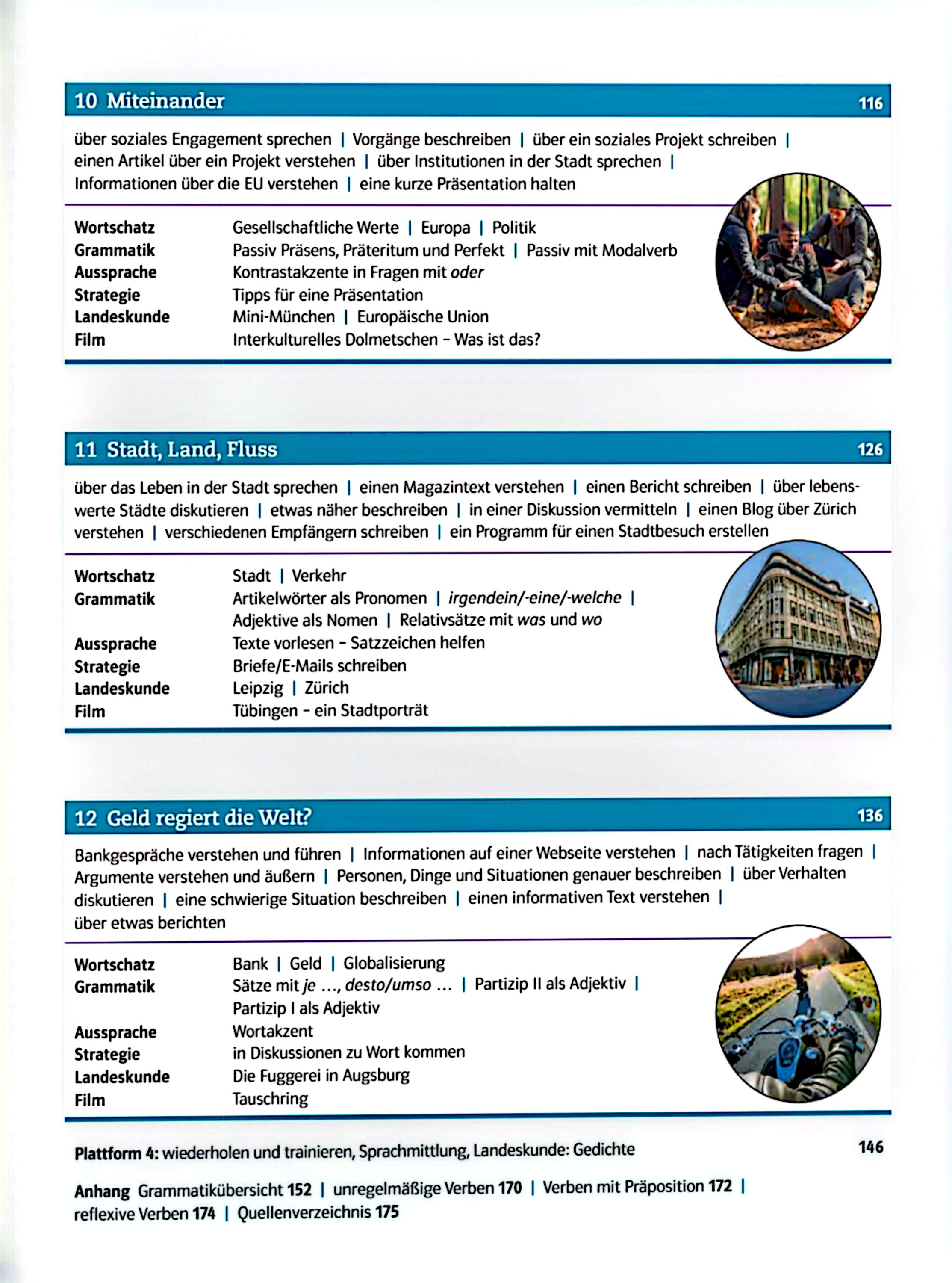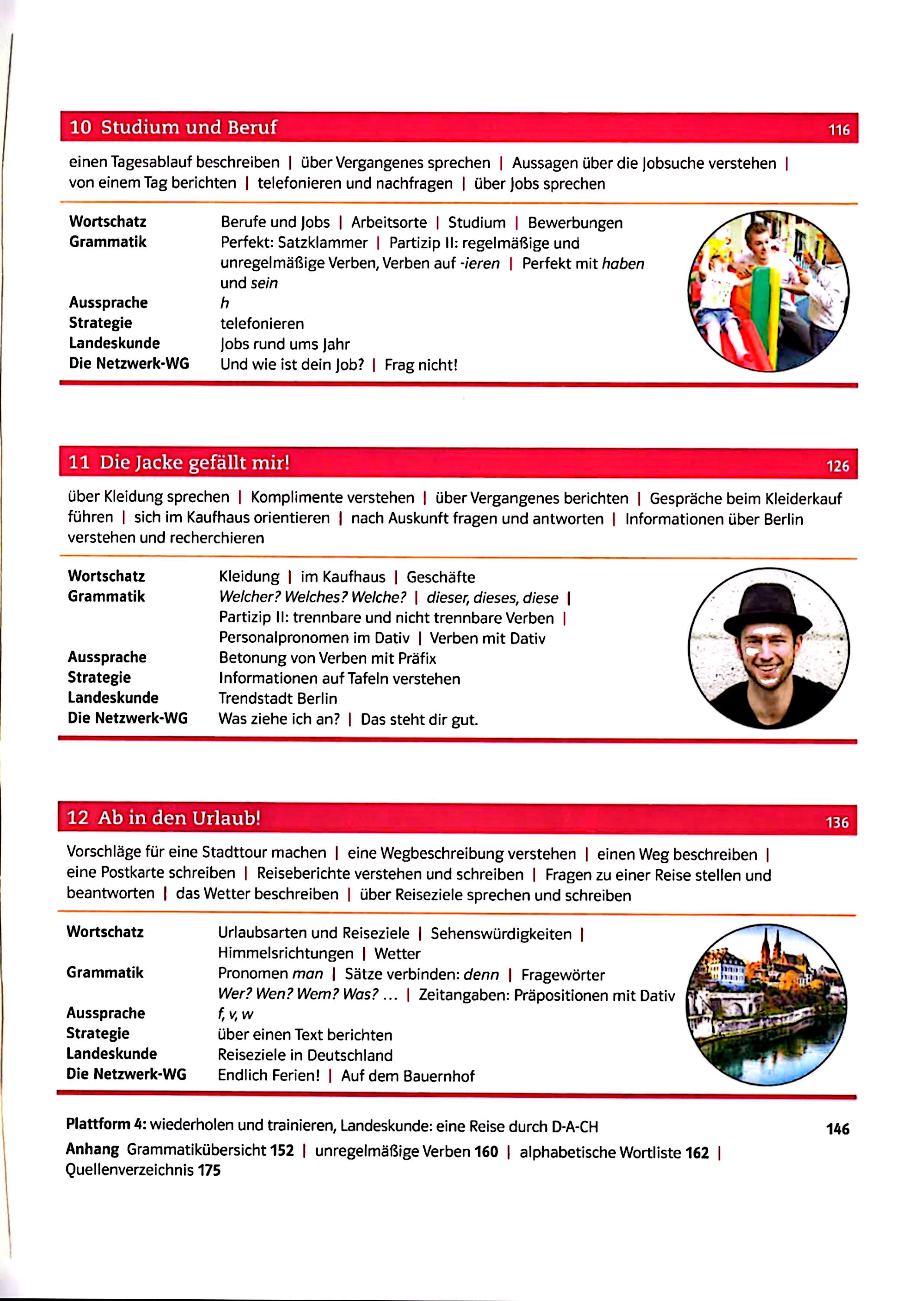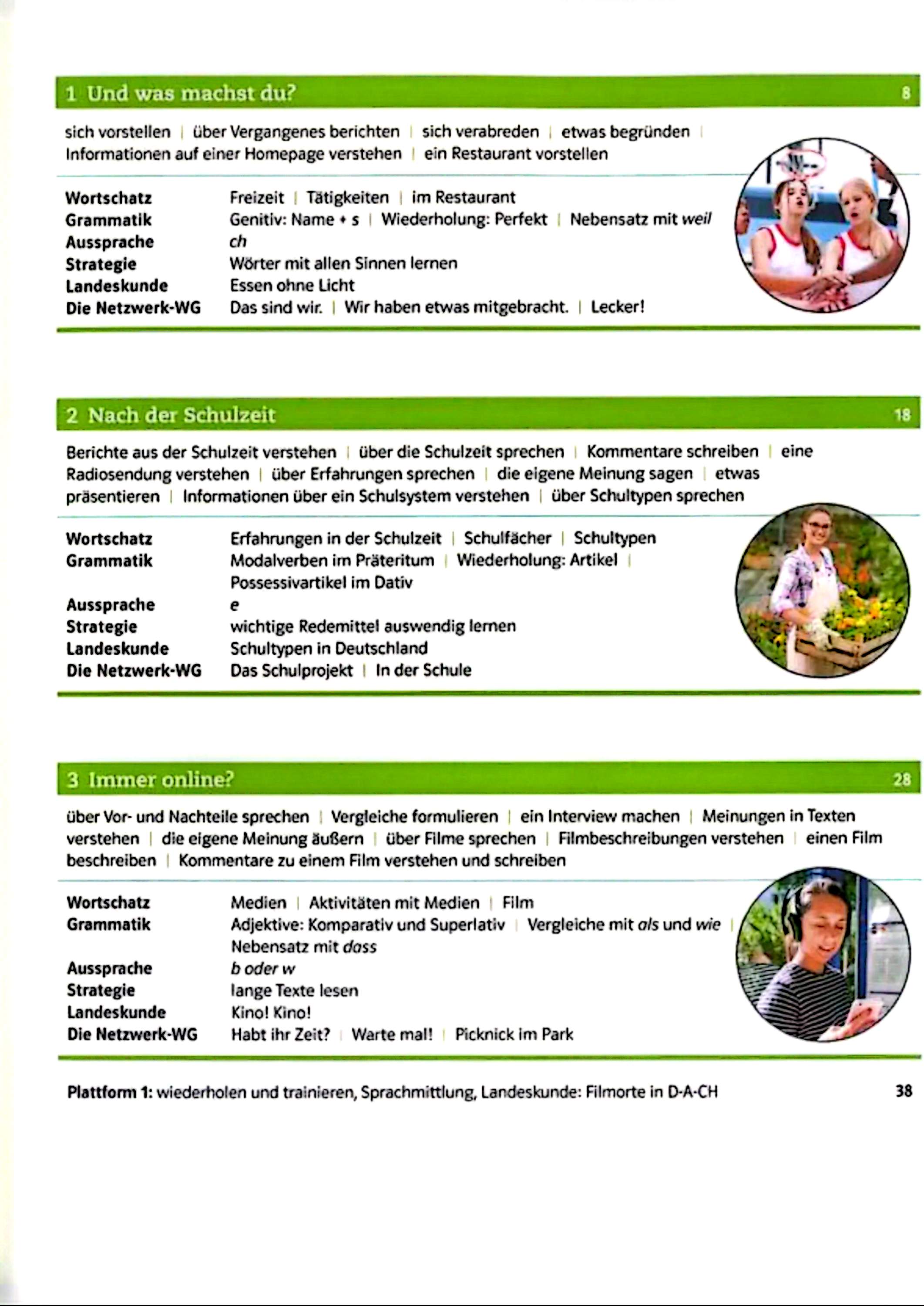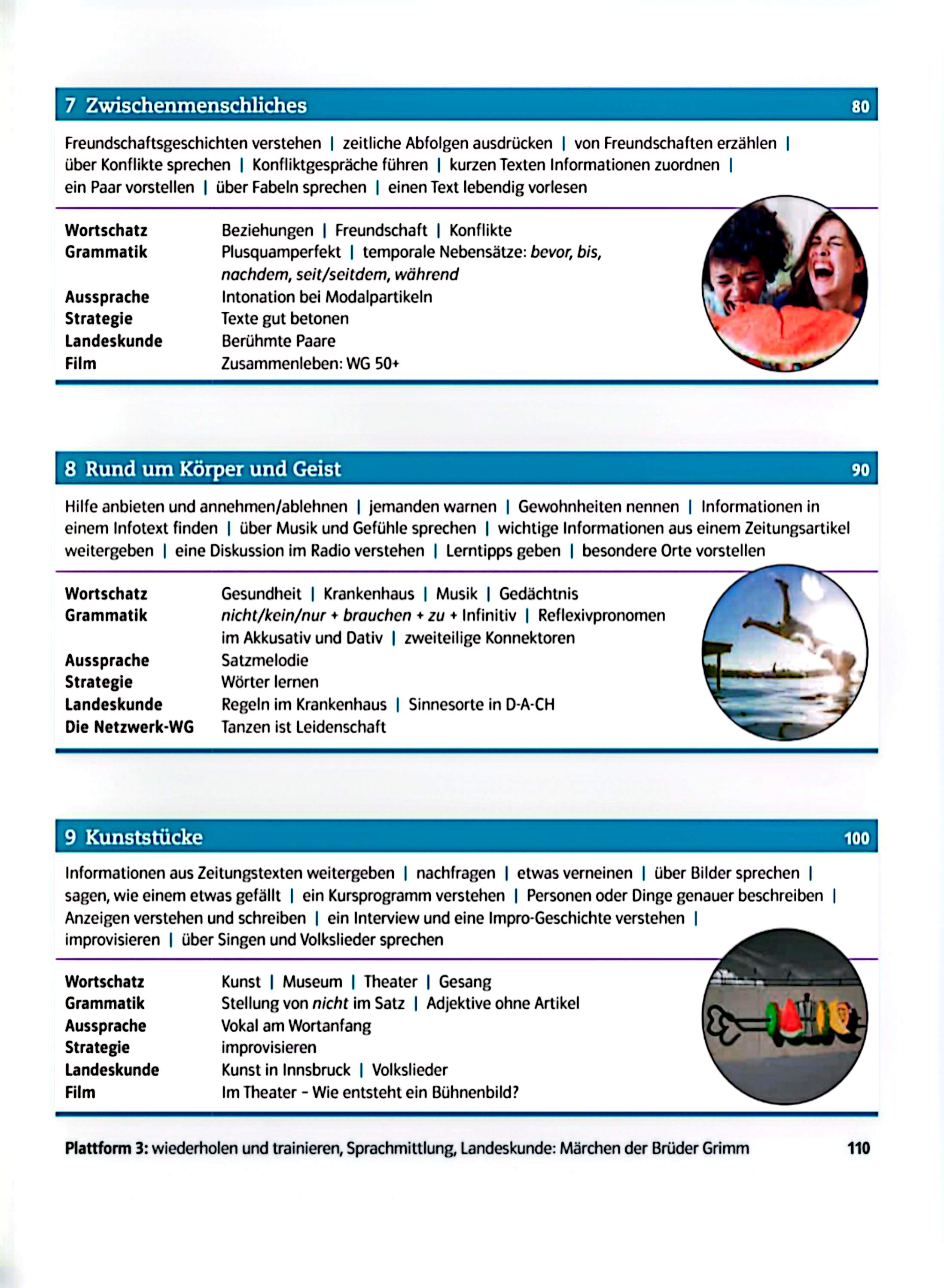 در بخش گرامر، ساختارهایی مثل جملههای وابسته با weil و dass، افعال جداشدنی، صفتهای مقایسهای و برتر، حالت Genitiv، حروف اضافه ترکیبی (Wechselpräpositionen) و زمان گذشته Perfekt و Präteritum آموزش داده میشوند.