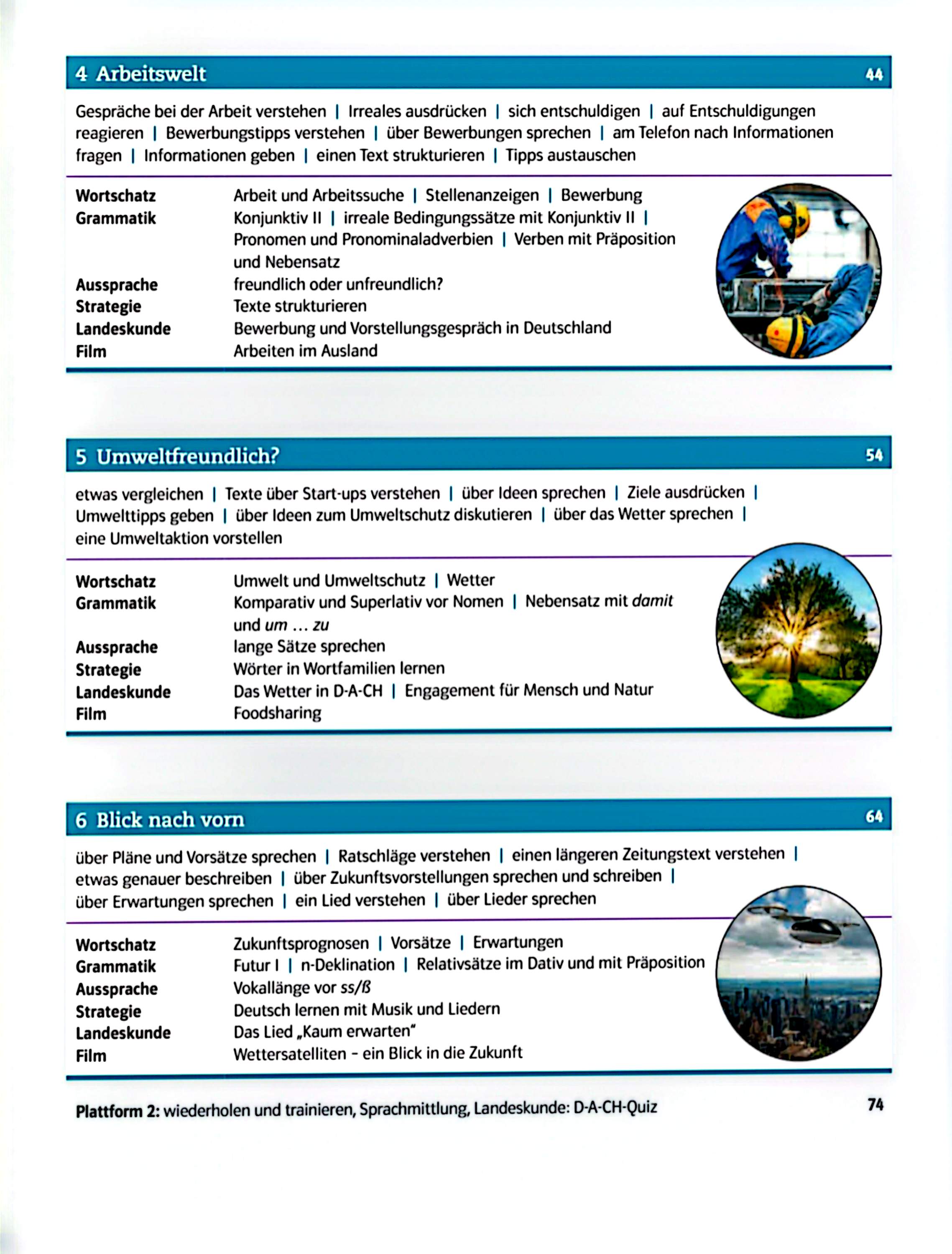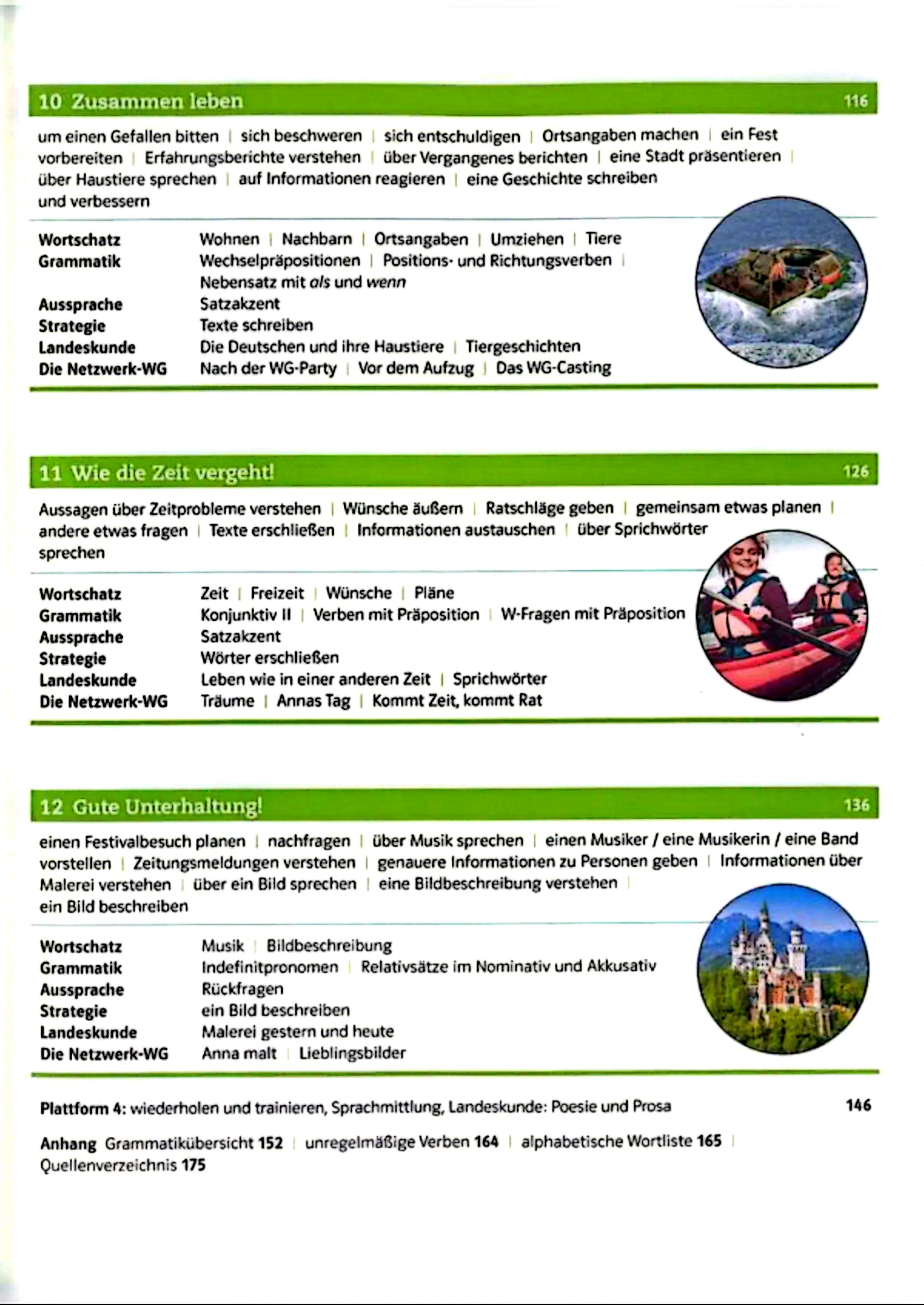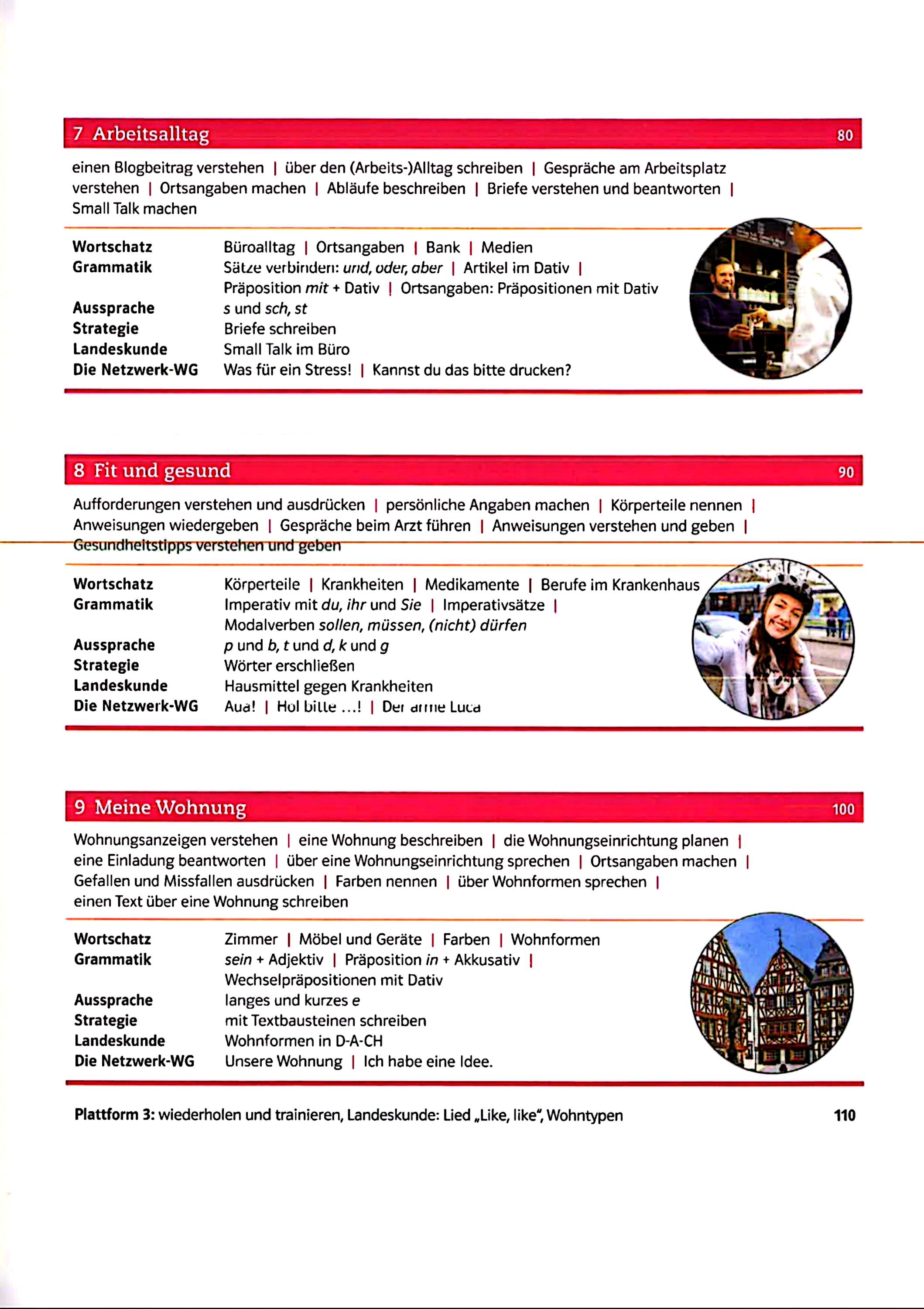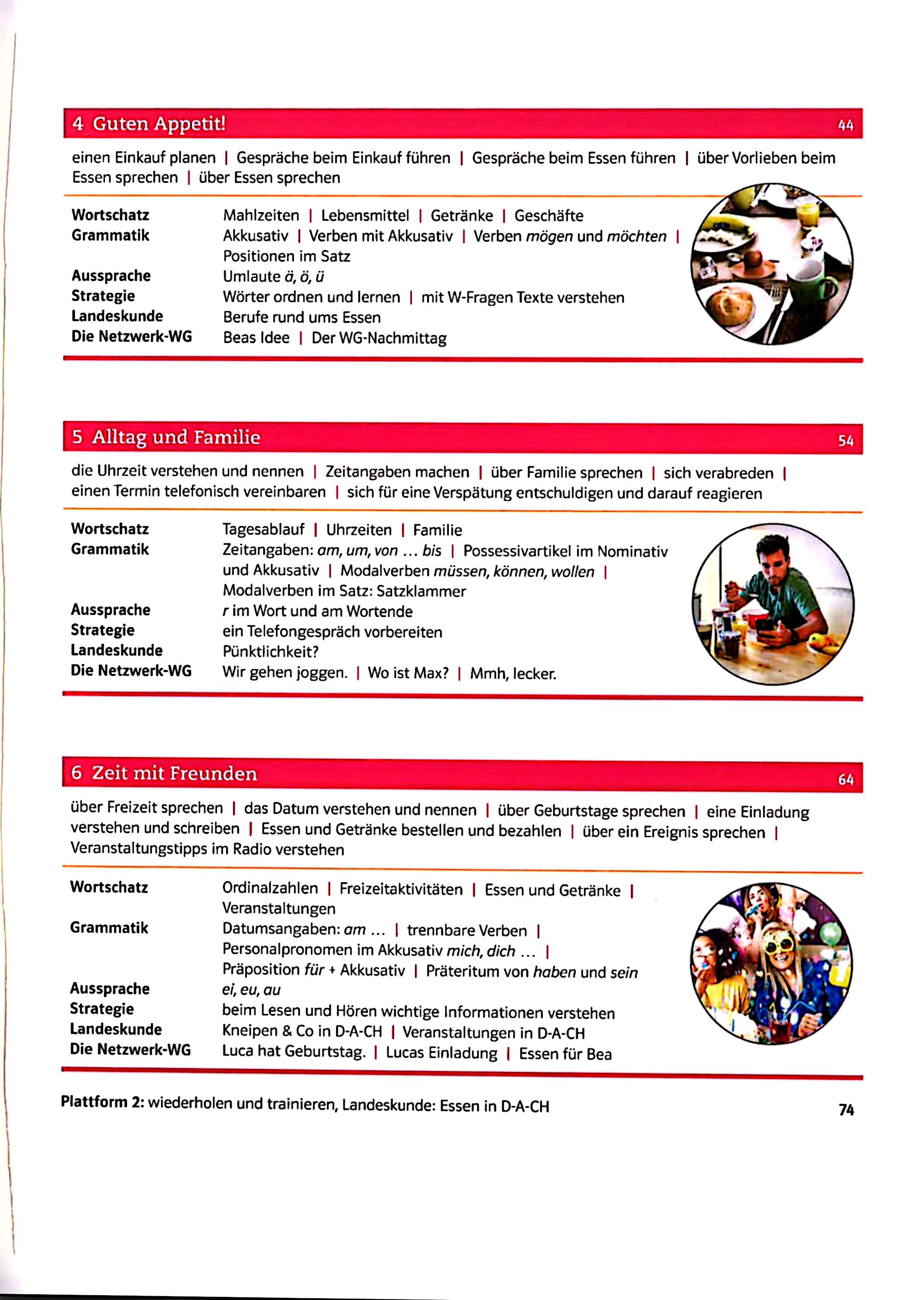 در بخش گرامر، ساختارهایی مثل جملههای وابسته با weil و dass، افعال جداشدنی، صفتهای مقایسهای و برتر، حالت Genitiv، حروف اضافه ترکیبی (Wechselpräpositionen) و زمان گذشته Perfekt و Präteritum آموزش داده میشوند.