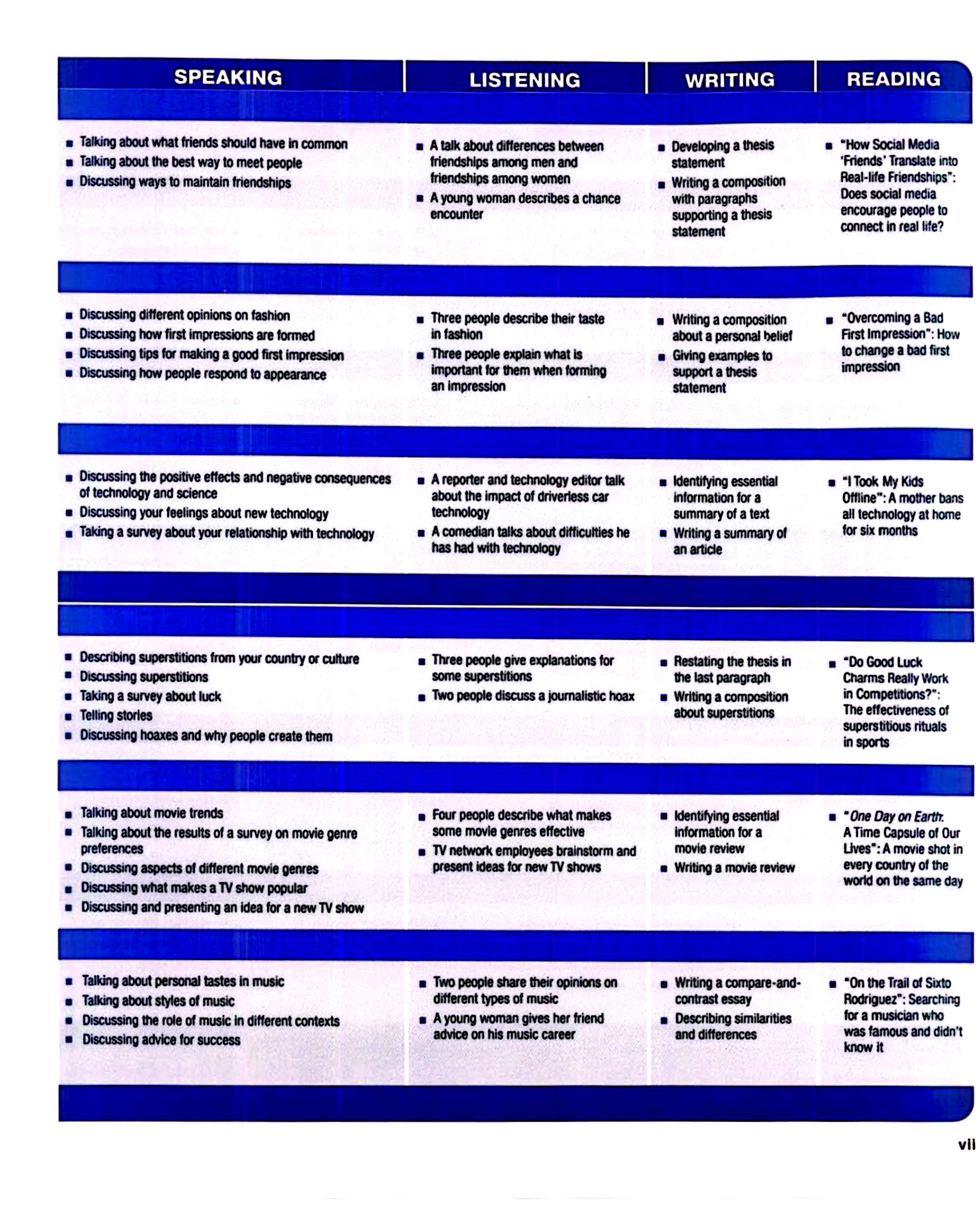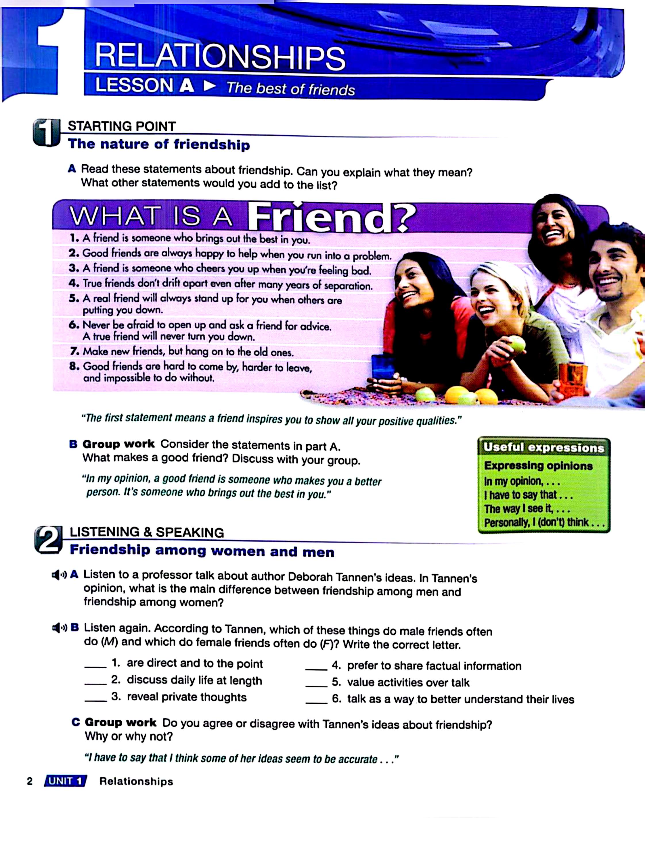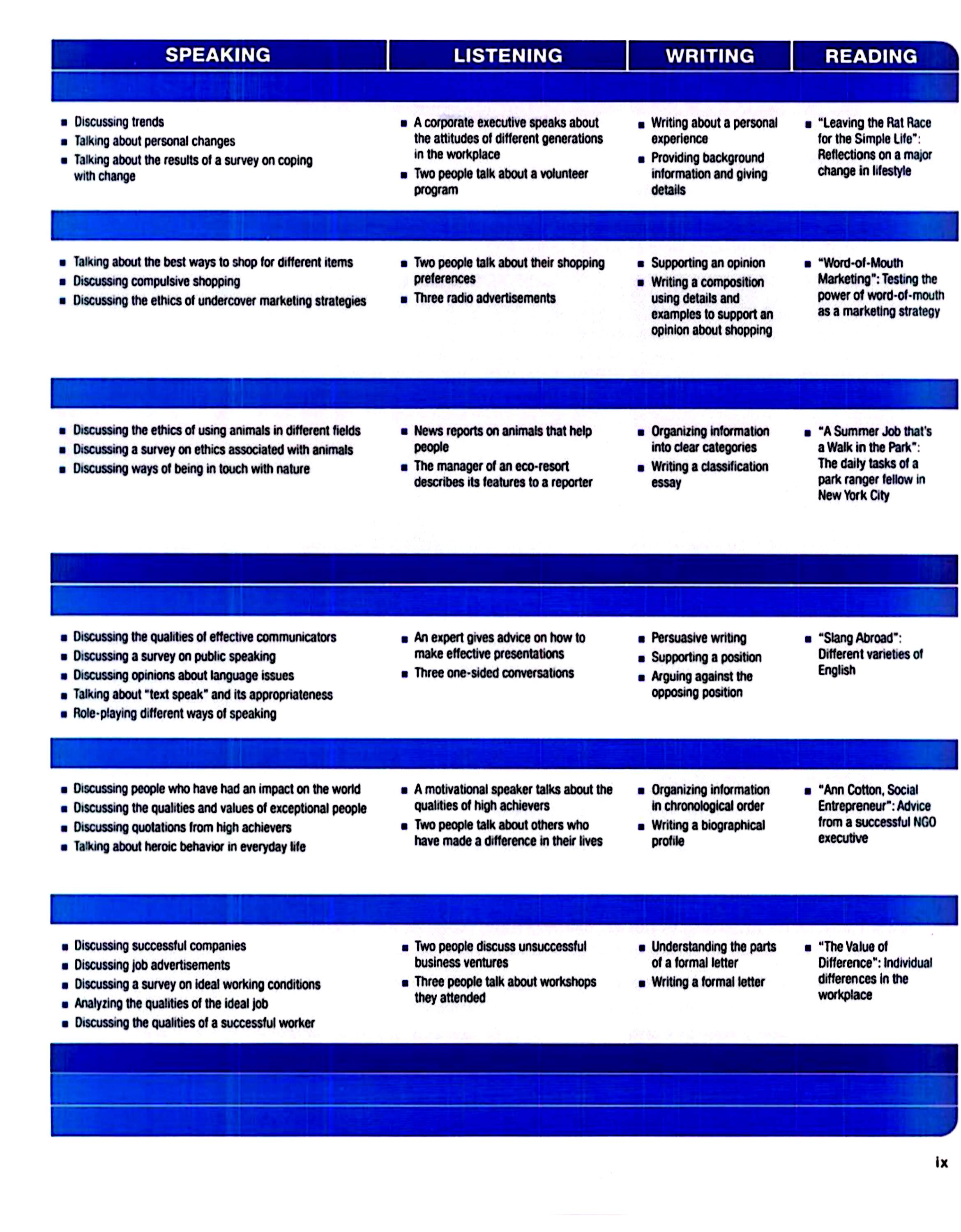 - در درس Generally Speaking درباره عادات فرهنگی و تفاوتها گفتگو میکند و مهارت بیان مقایسه و تعمیم را