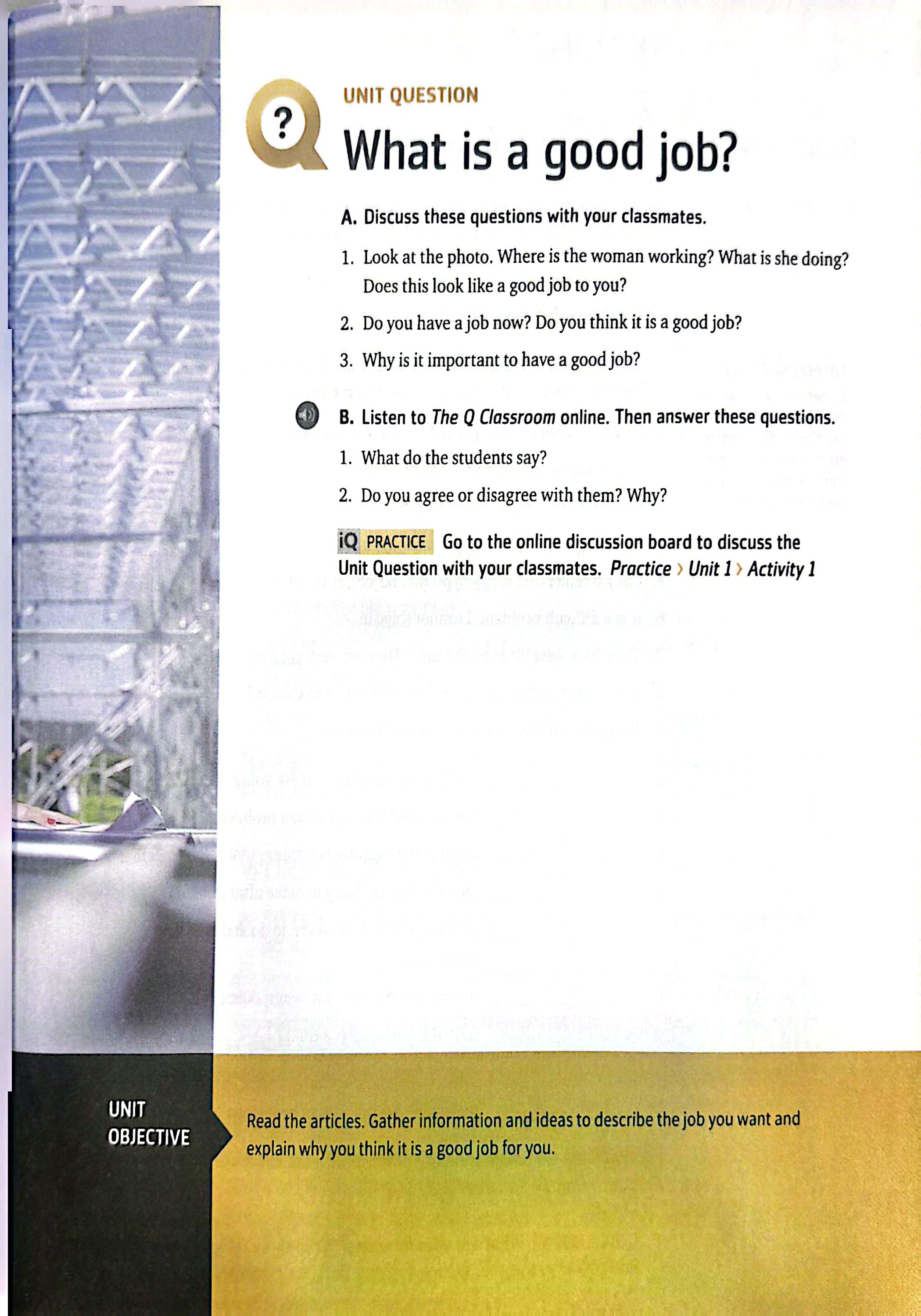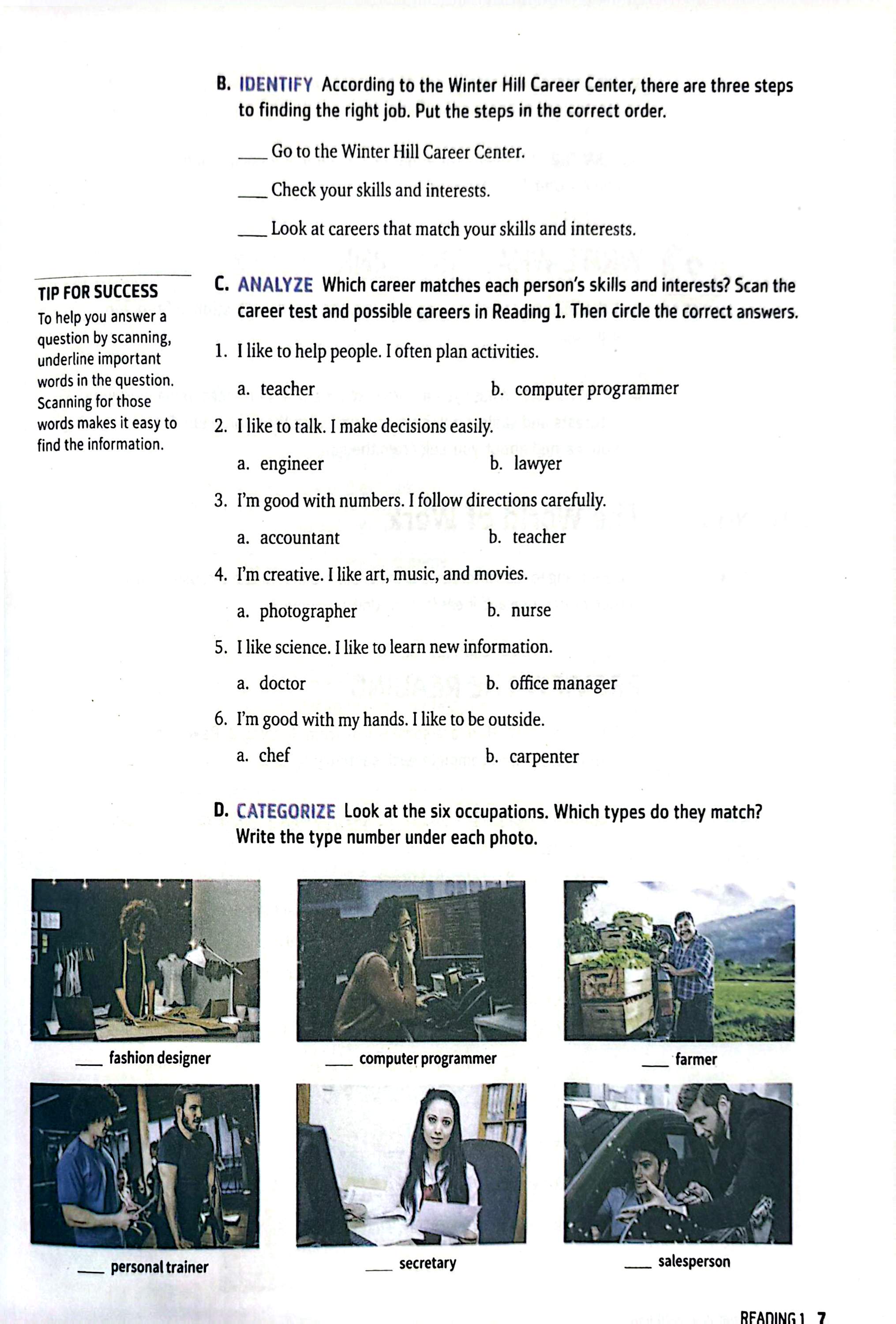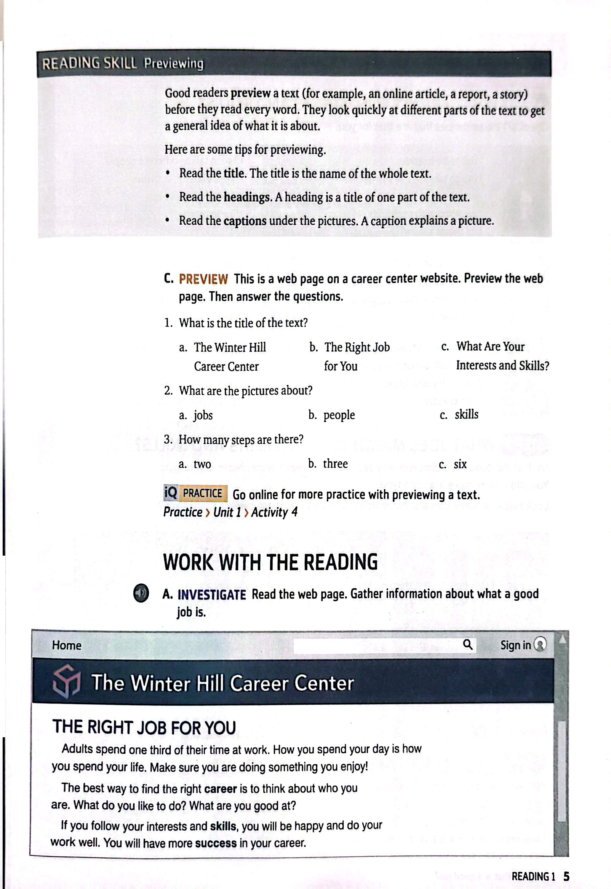 • در درس اول با موضوع شغل مناسب روبهرو میشویم. زبانآموز یاد میگیرد ایده اصلی را پیدا کند، فعلهای want / need / like + infinitive را بهکار ببرد و درباره شغل مناسب خودش یک پاراگراف ساده بنویسد.
