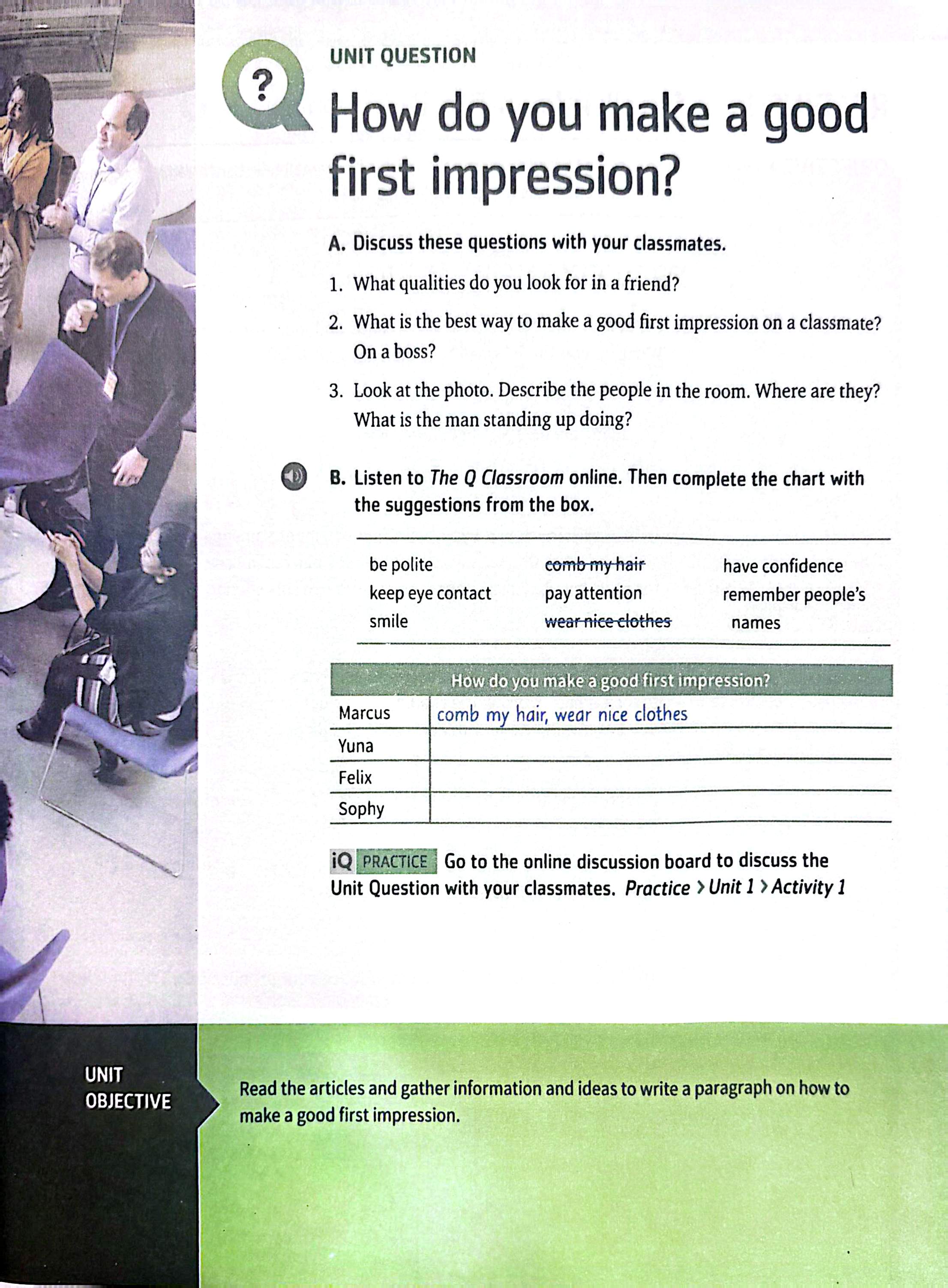 • در درس اول موضوع اثرگذاری در برخورد نخست بررسی میشود. زبانآموز یاد میگیرد زنجیره علت و معلول را تشخیص دهد، ایده اصلی را از جزئیات جدا کند، از شرطی واقعی برای بیان توصیهها استفاده کند و یک پاراگراف «چگونه…؟» بنویسد.