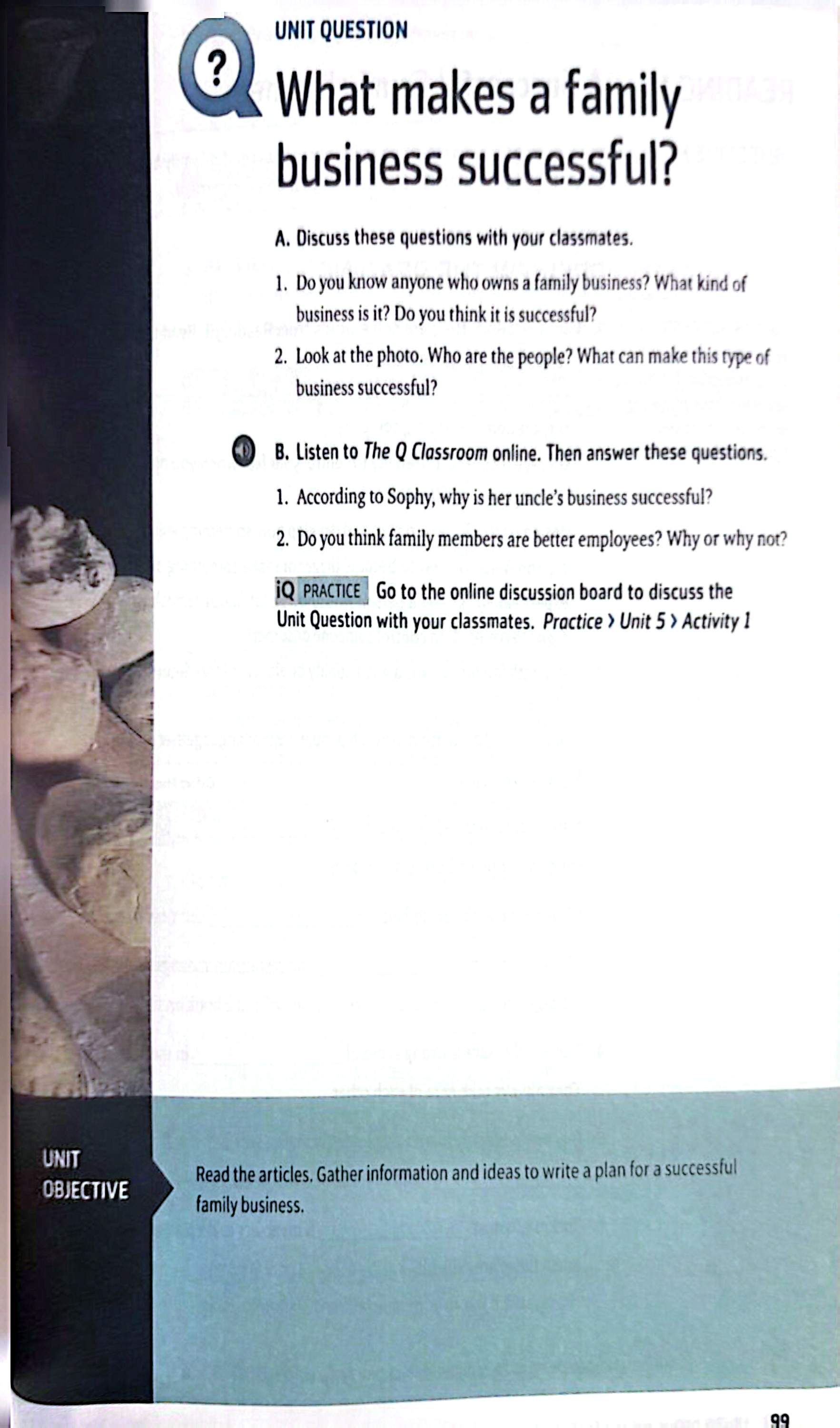 • در درس پنجم موفقیت در کسبوکار خانوادگی مطرح میشود. مهارت اسکن متن، نتیجهگیری، استفاده از صفات مقایسهای و ساخت پاراگراف منسجم در این درس تمرین میشود.