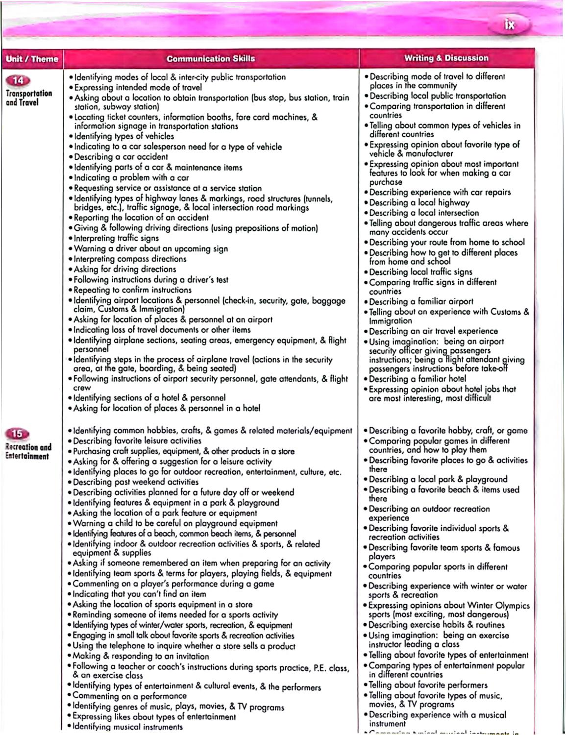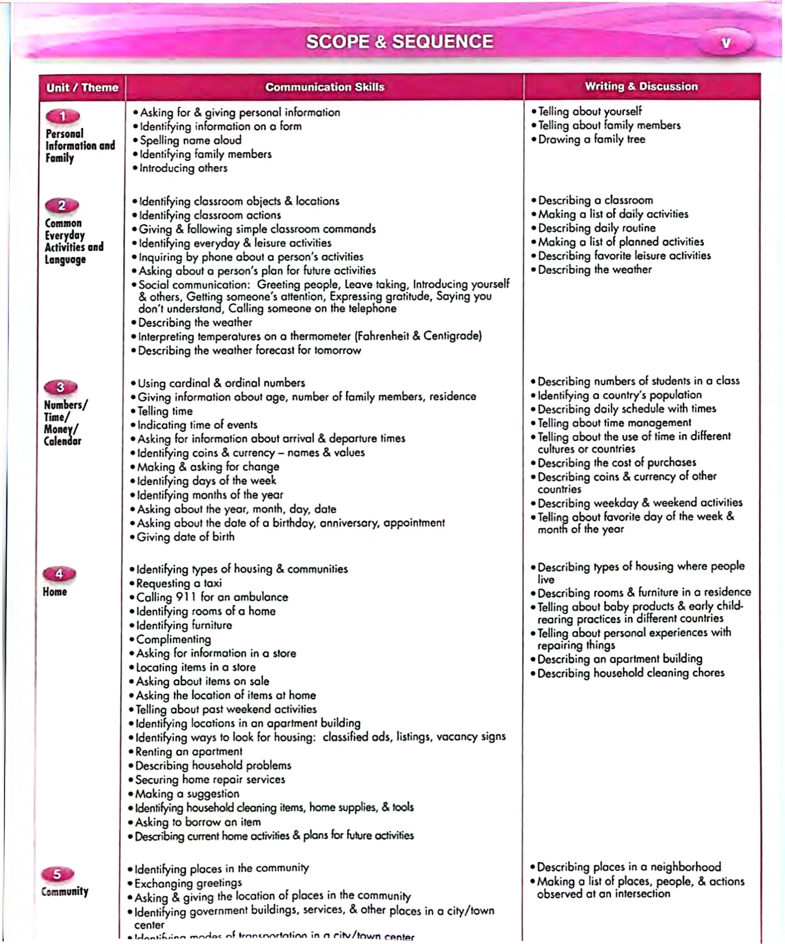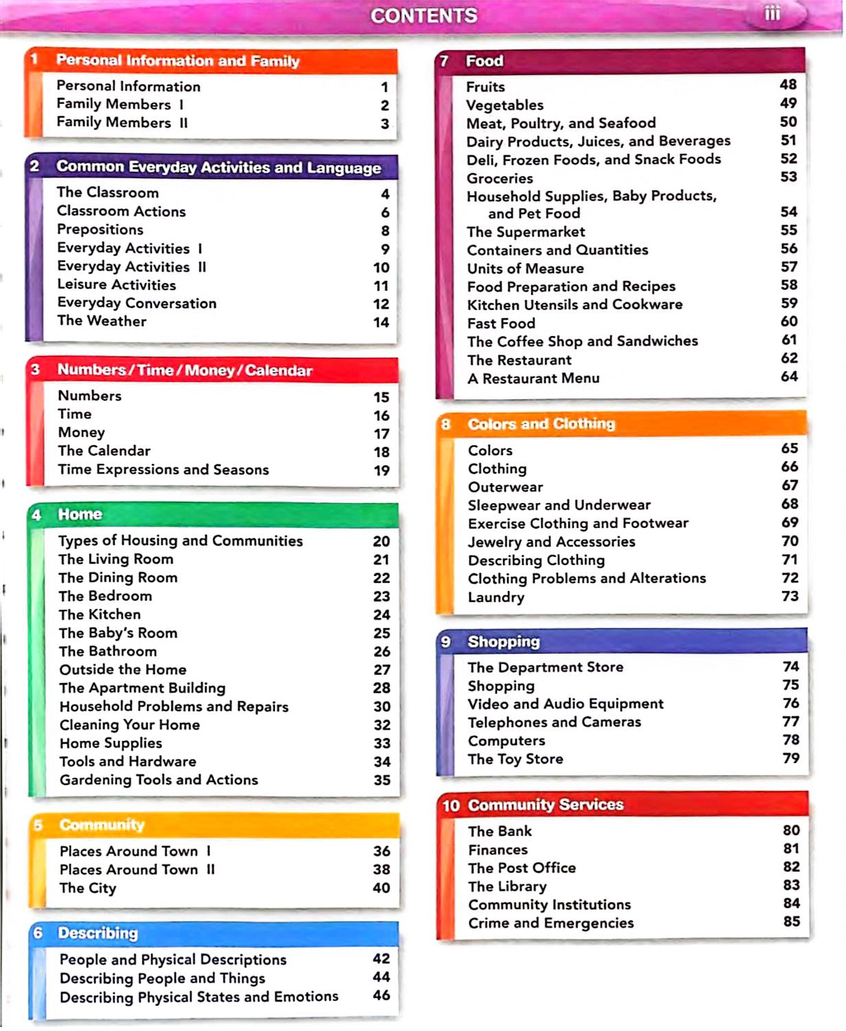 در بخشهای ابتدایی، کتاب به اطلاعات شخصی و خانواده، فعالیتهای روزمره، کلاس