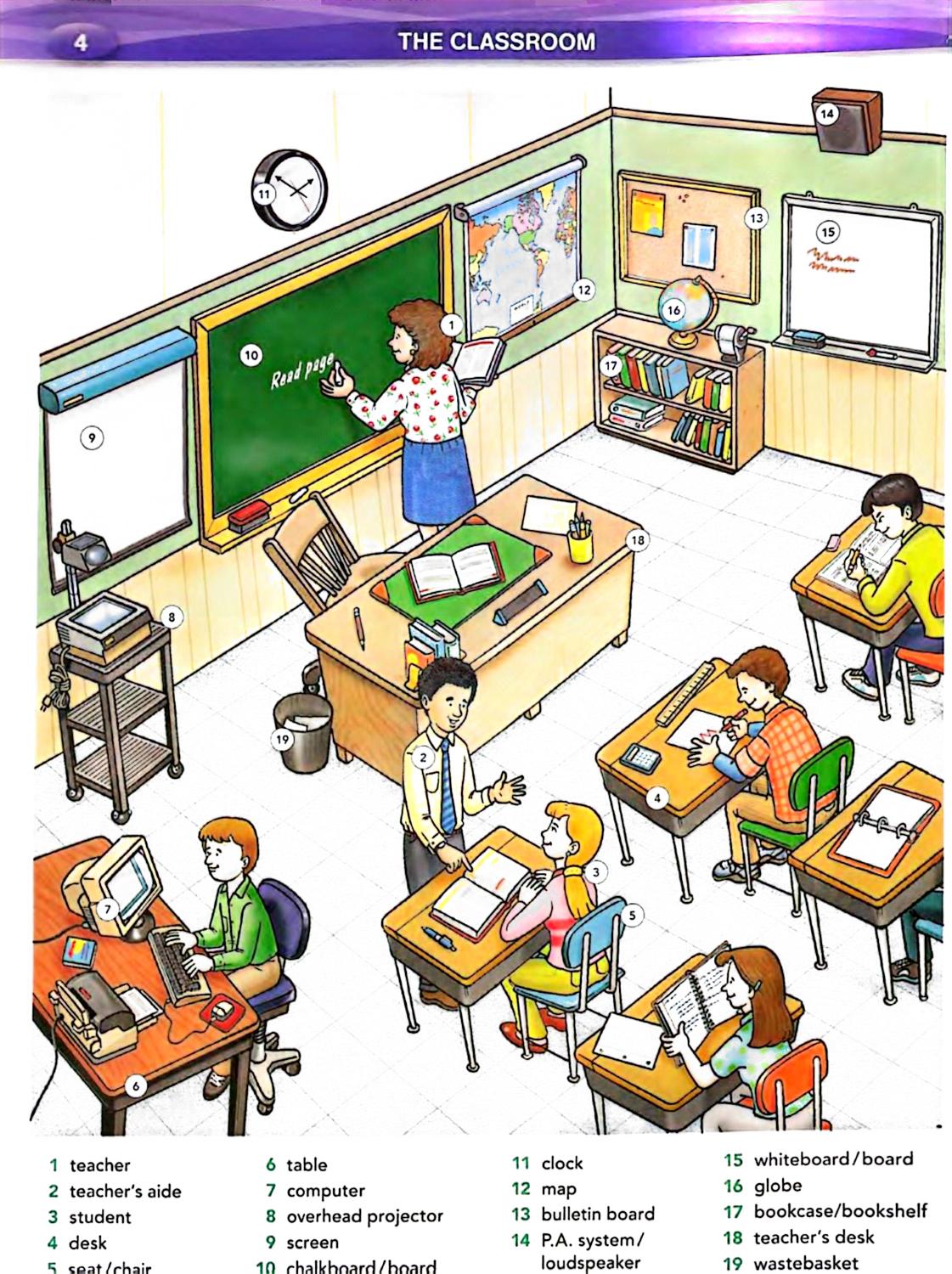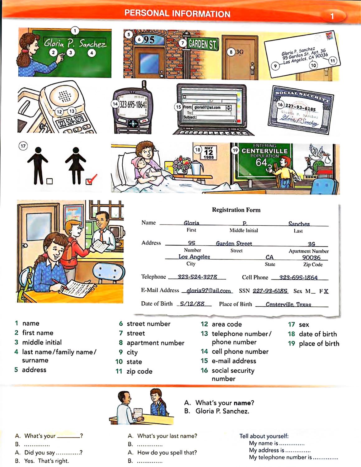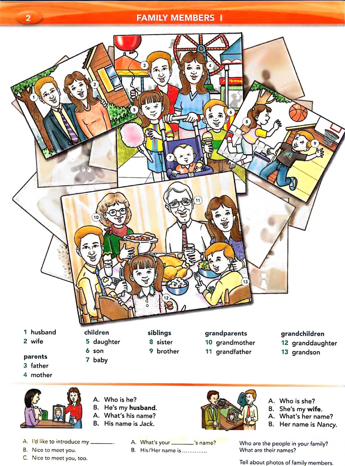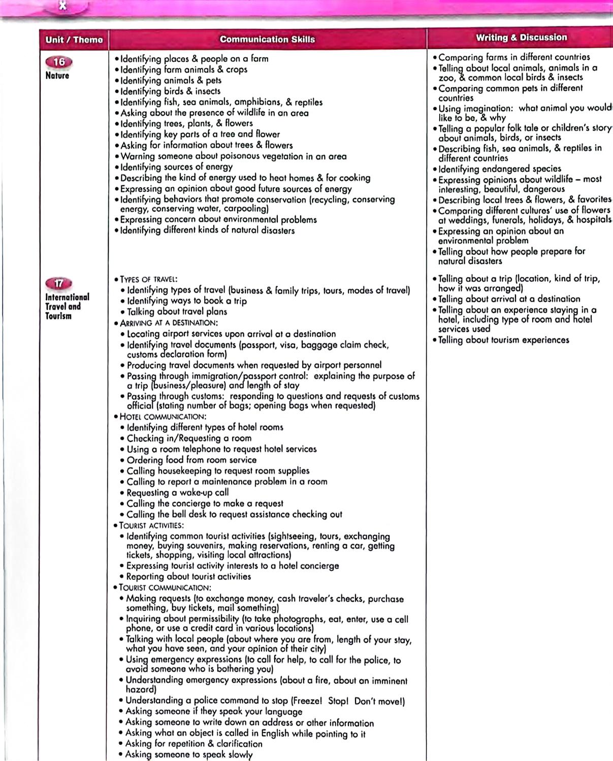 در بخشهای ابتدایی، کتاب به اطلاعات شخصی و خانواده، فعالیتهای روزمره، کلاس