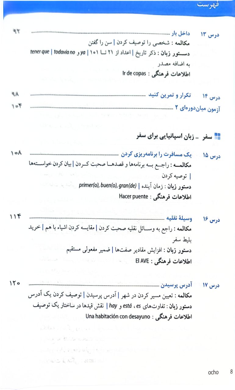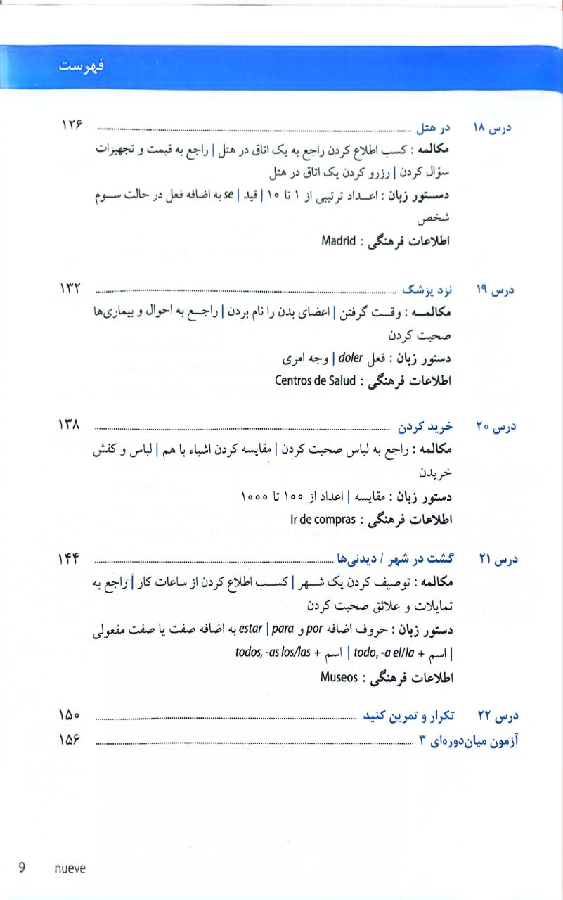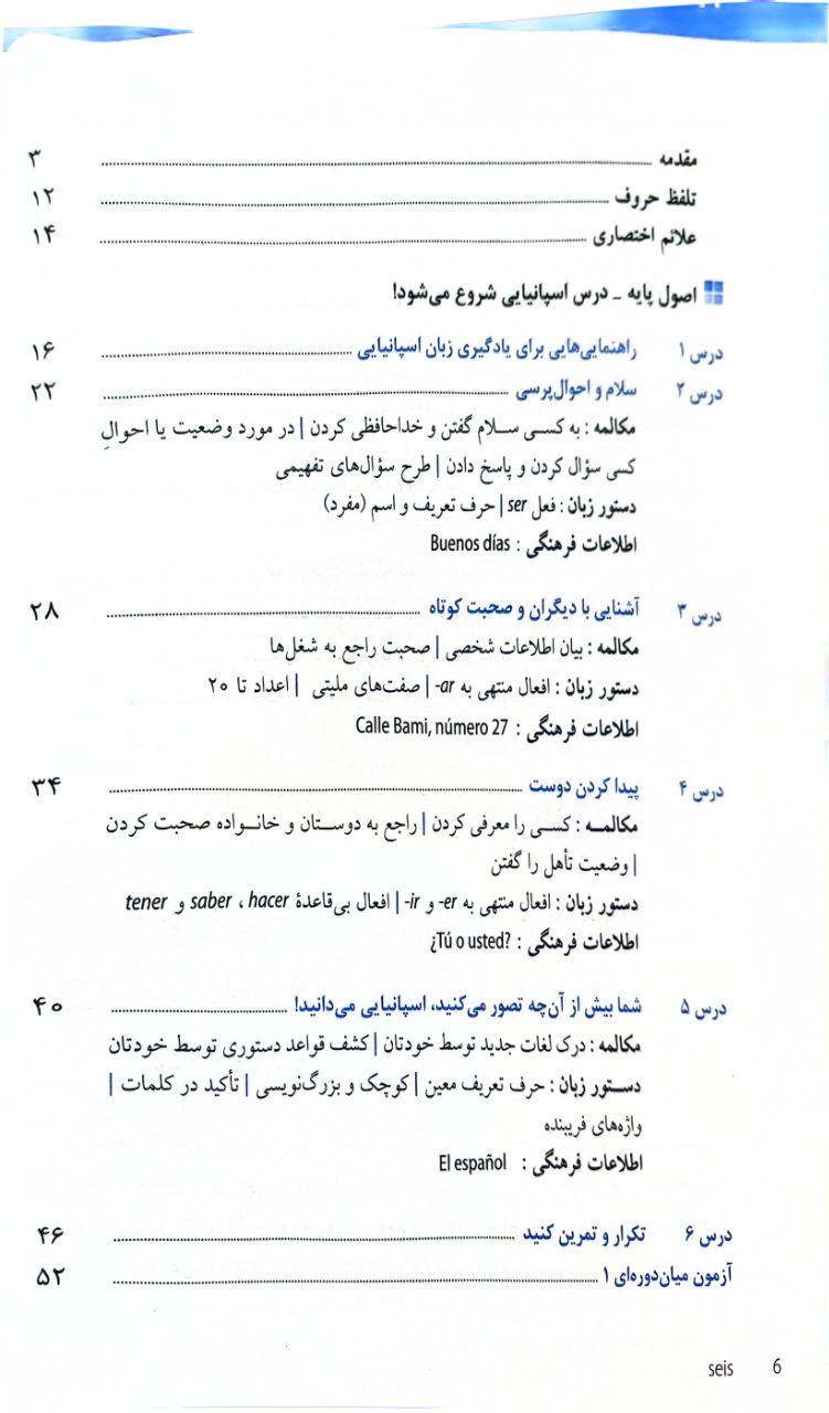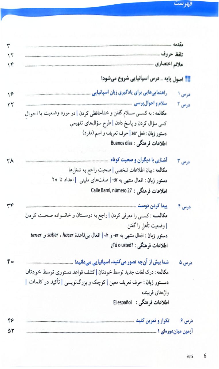 گذشته. این بخشها گرامرهایی مانند افعال انعکاسی، صفتها، افعال querer و poder و ir، ضمیر مفعولی غیرمستقیم، حرف اضافه a، صفتهای اشاره و تفاوت ser و estar را توضیح میدهند.