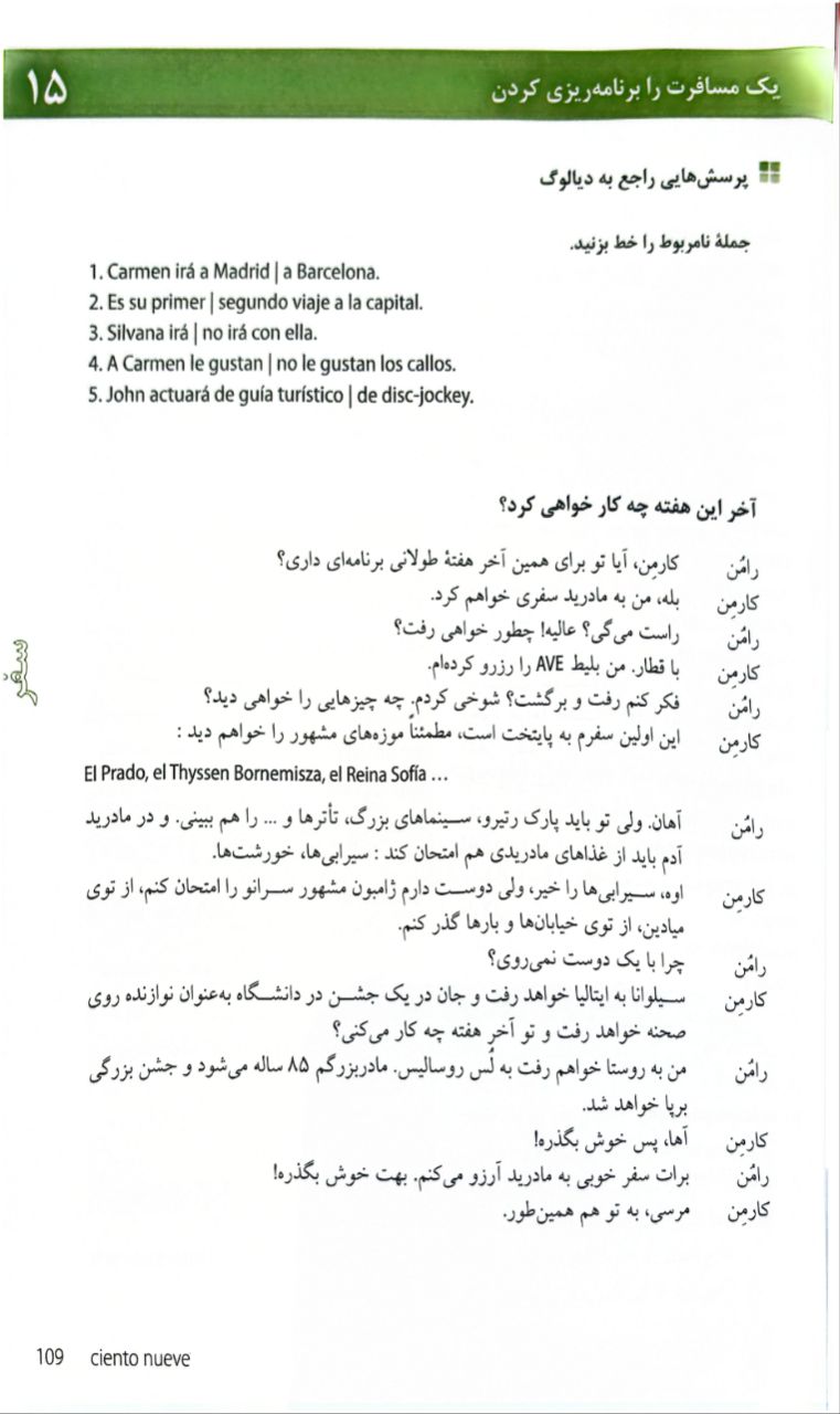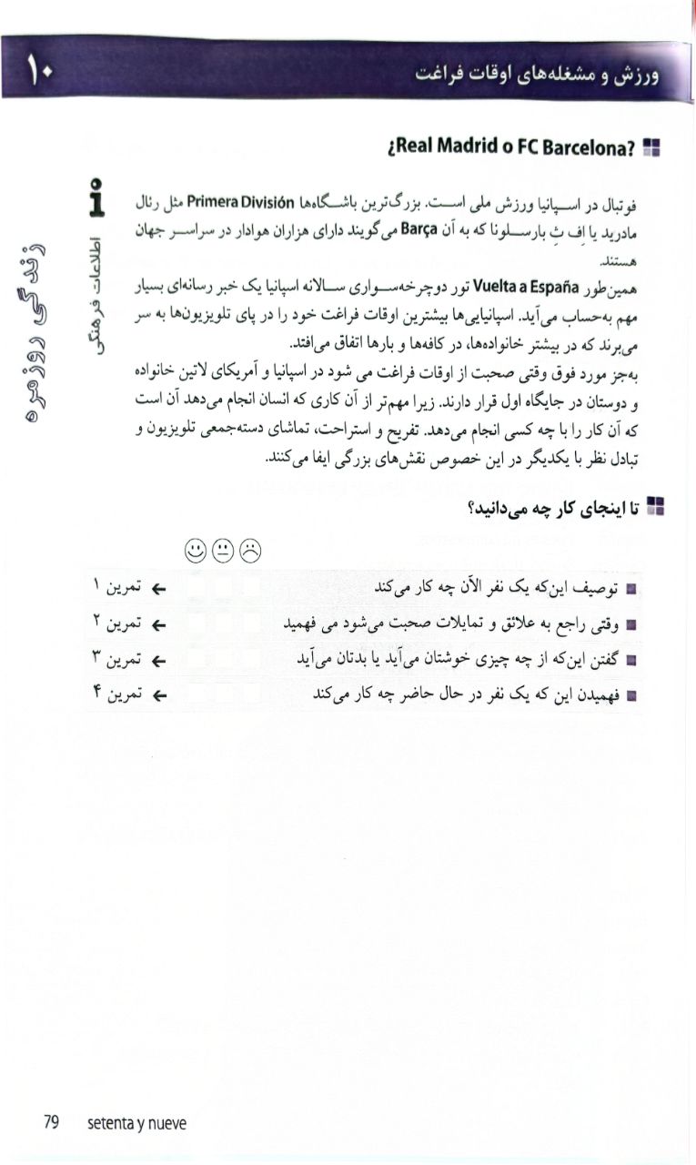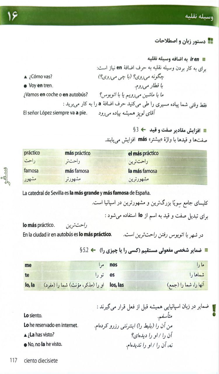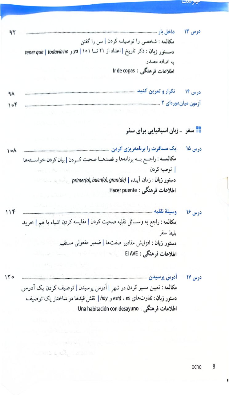 گذشته. این بخشها گرامرهایی مانند افعال انعکاسی، صفتها، افعال querer و poder و ir، ضمیر مفعولی غیرمستقیم، حرف اضافه a، صفتهای اشاره و تفاوت ser و estar را توضیح میدهند.
