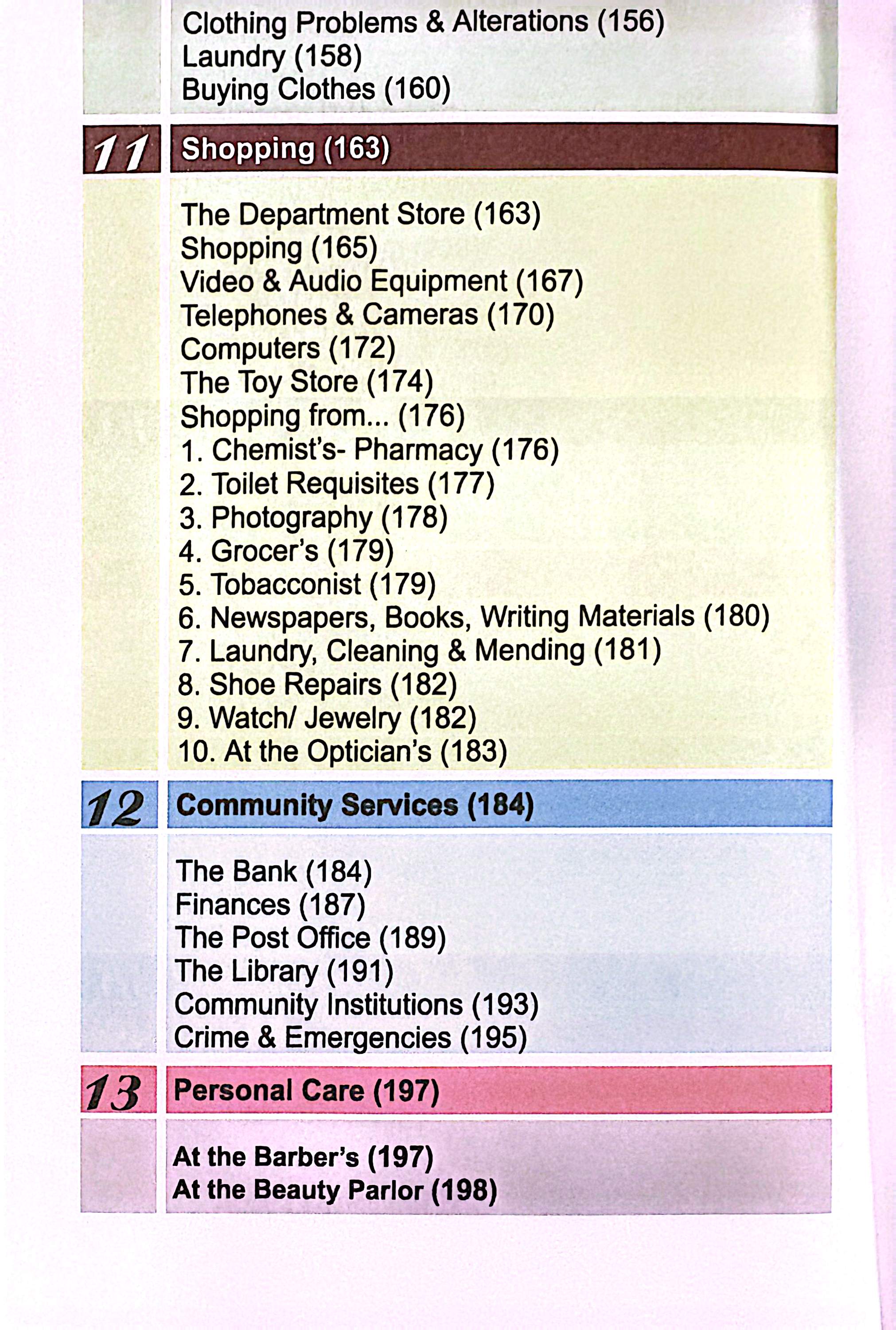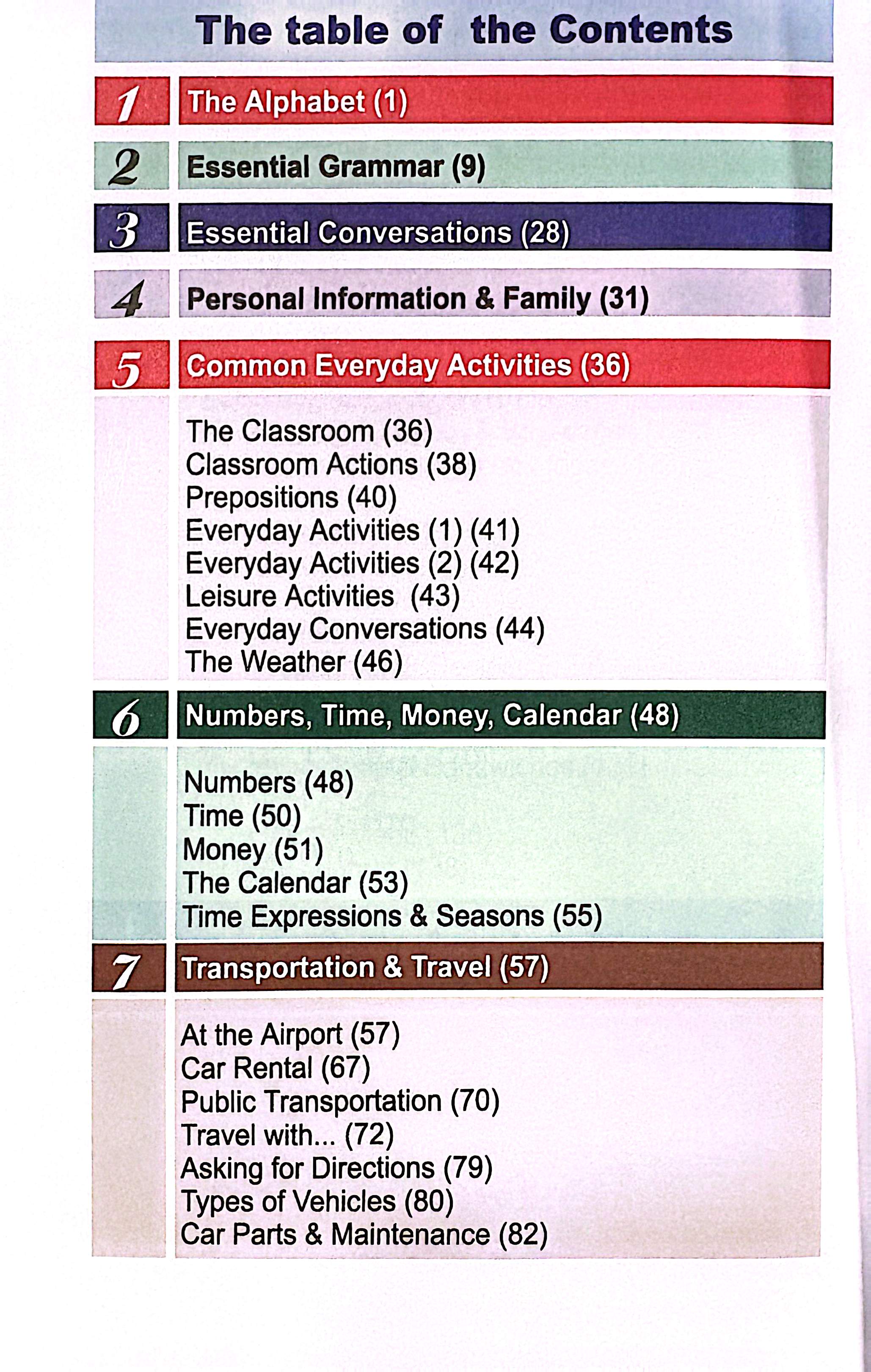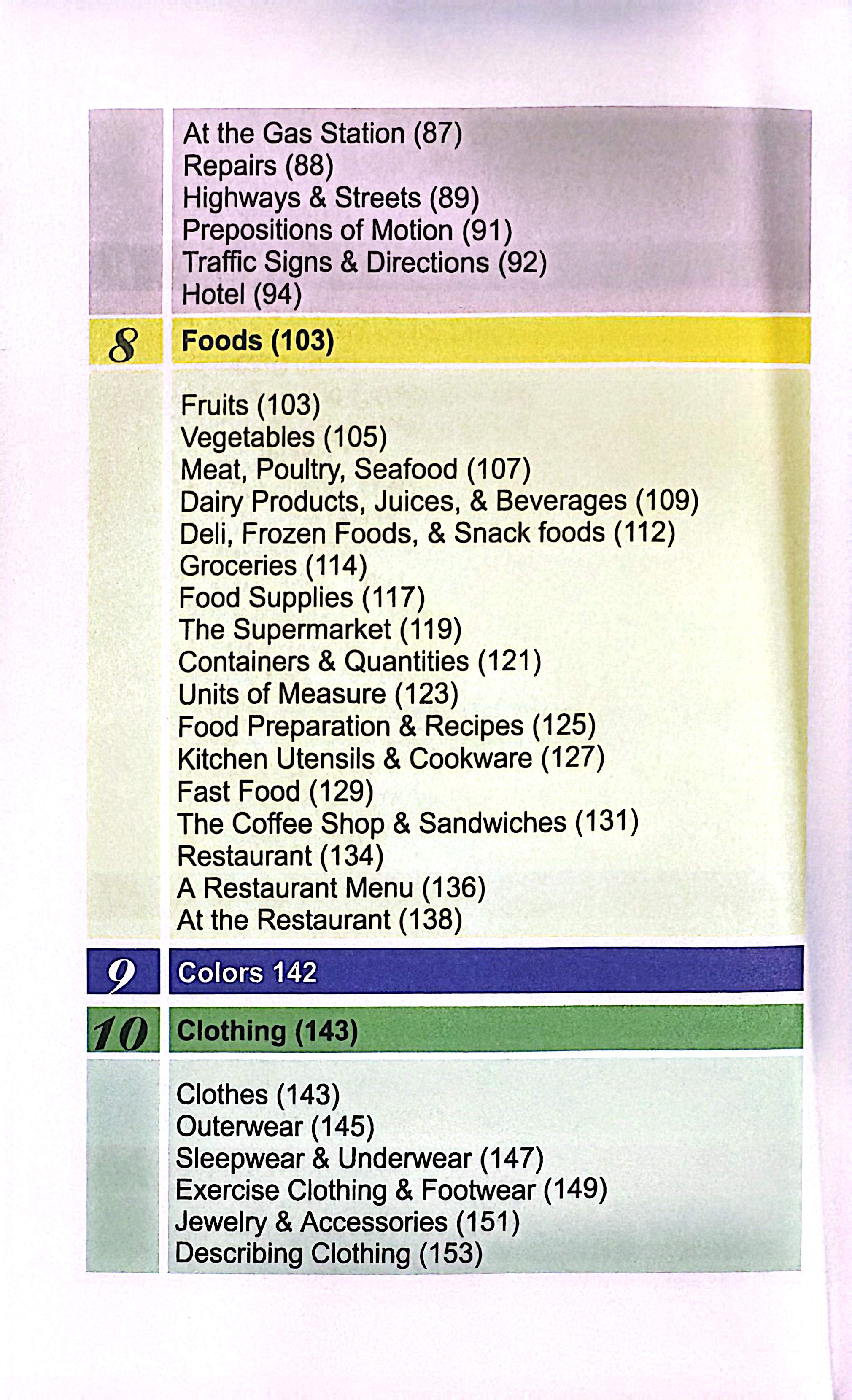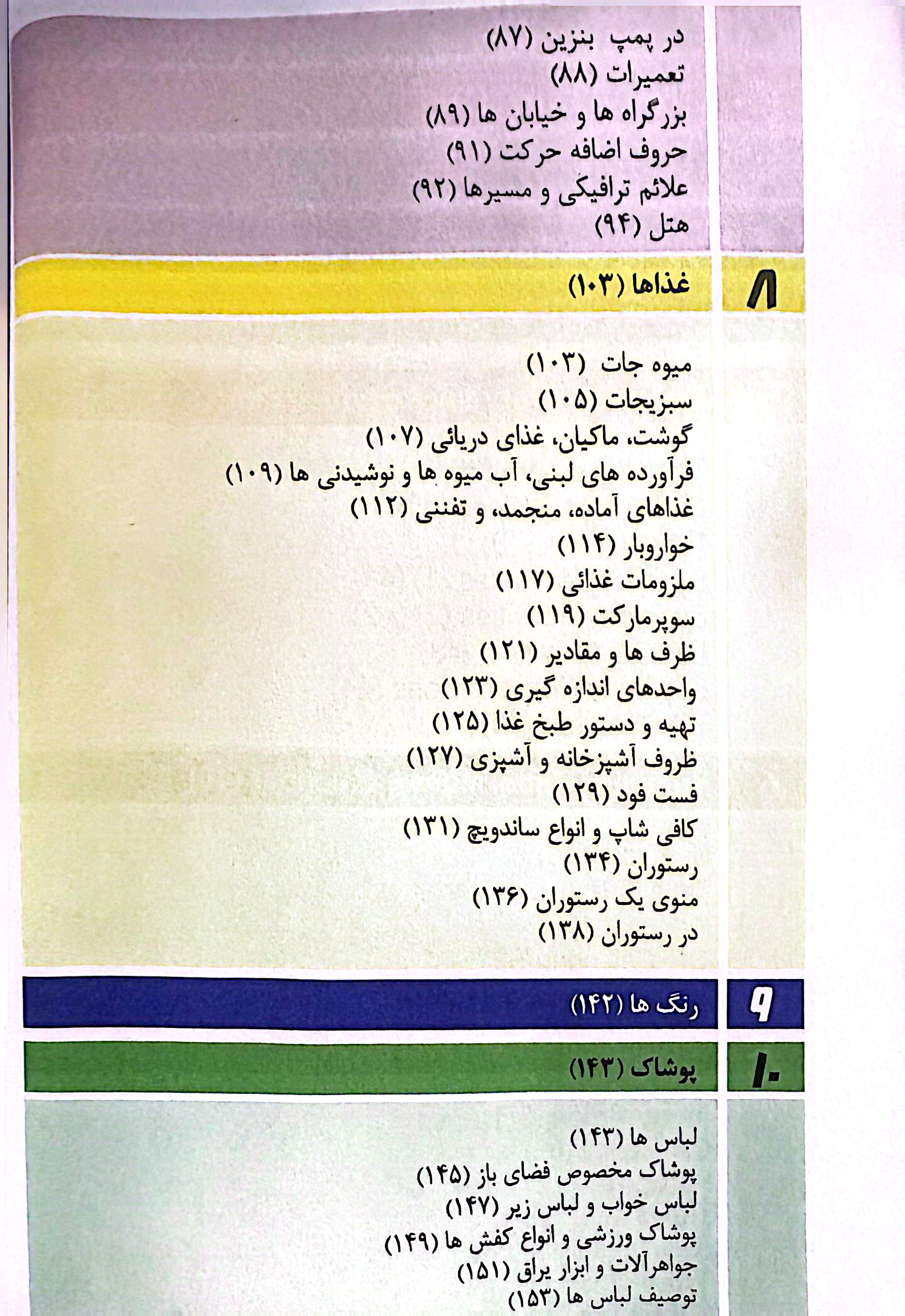 فعالیتهای روزمره، زمان و تاریخ، حملونقل، غذا، خرید، پوشاک، خدمات شهری، خانه،