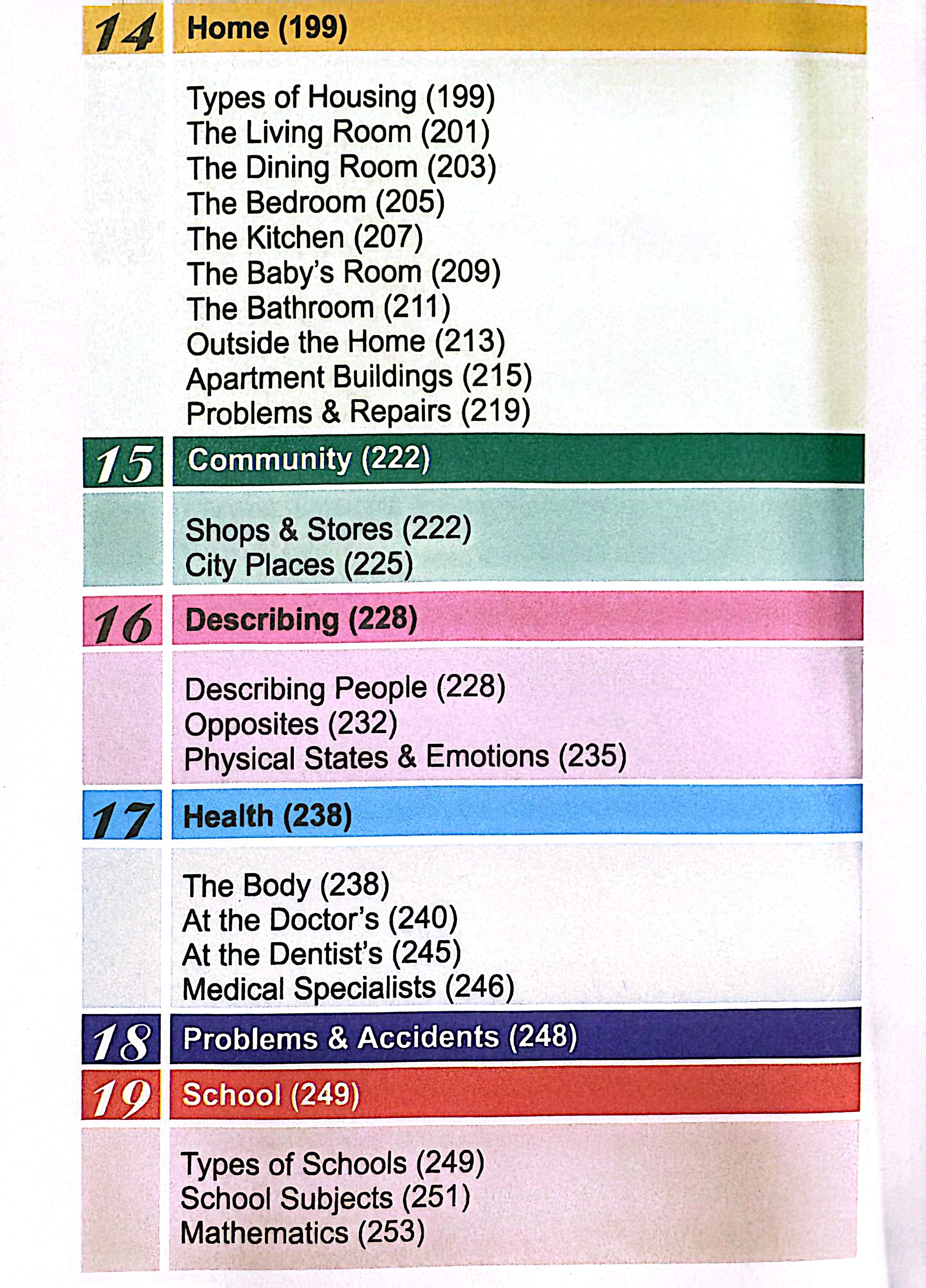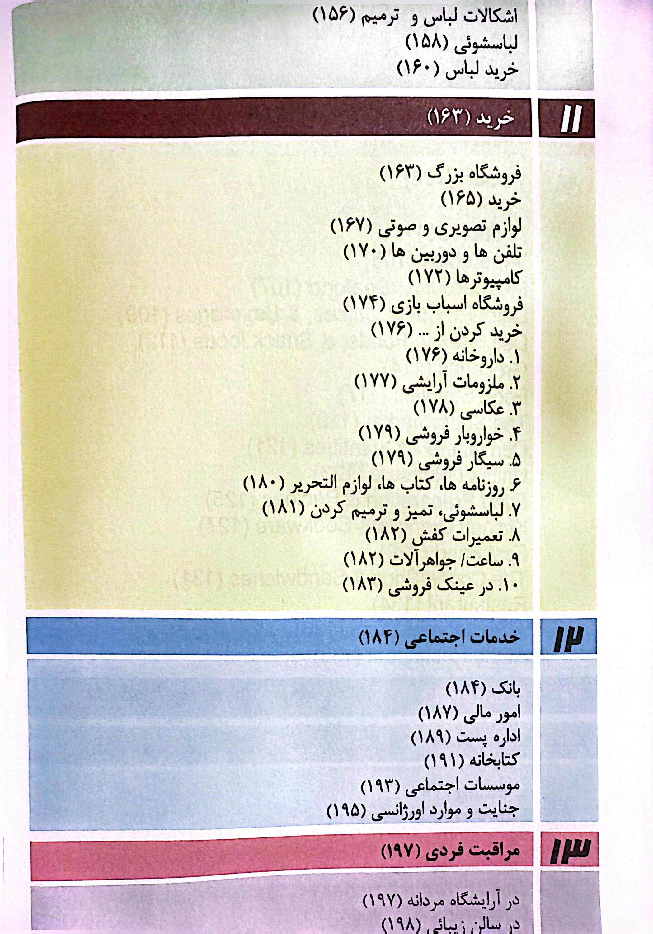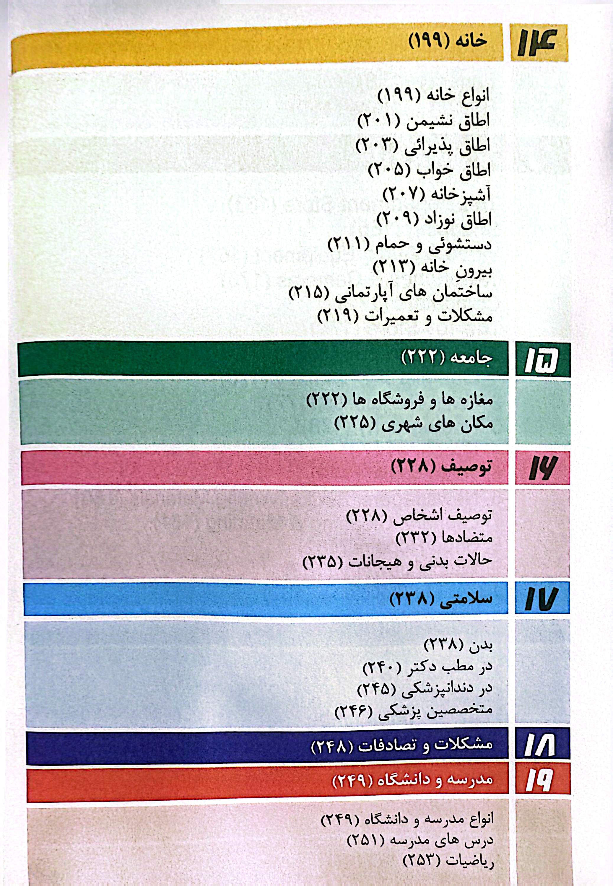 موضوعات پیچیدهتری مثل خرید لباس، مکانهای شهری، توصیف افراد، سلامتی، مراجعه به