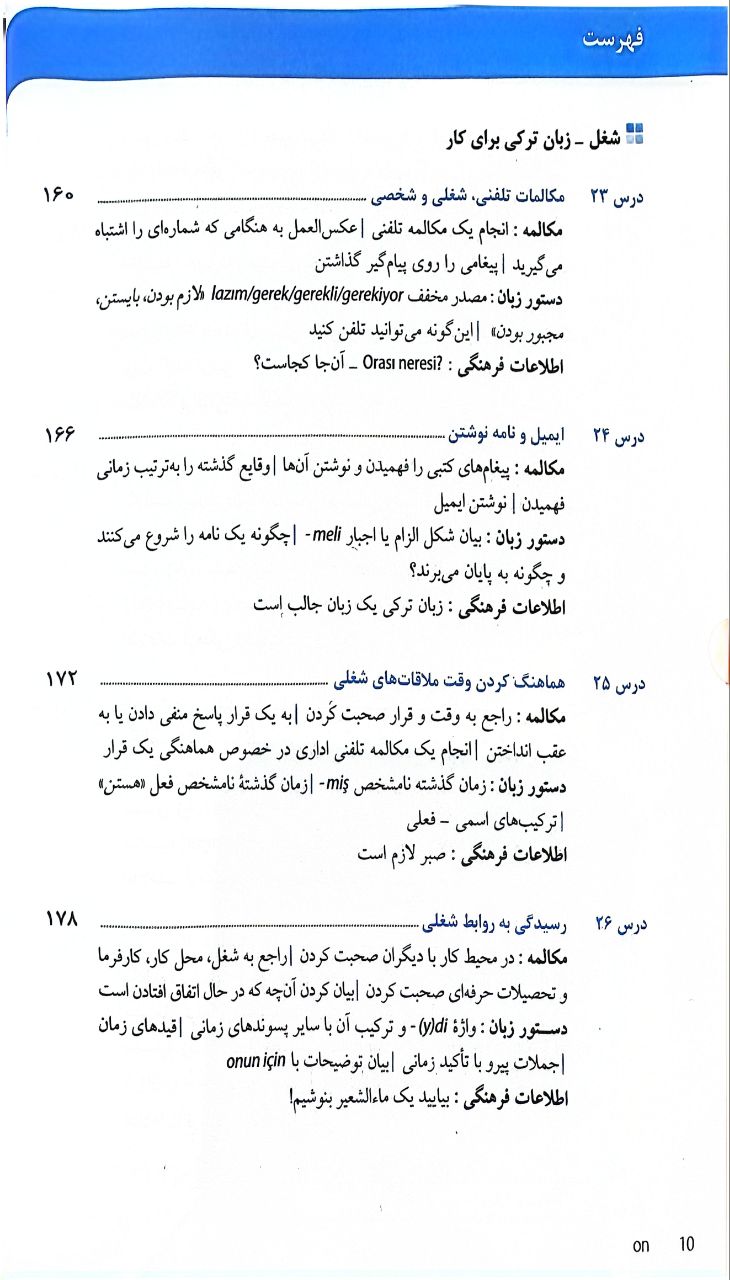 در بخش «ترکی برای کار»، تمرکز بر مکالمات اداری، نوشتن ایمیل و نامه، تعیین وقت ملاقات، صحبت درباره
