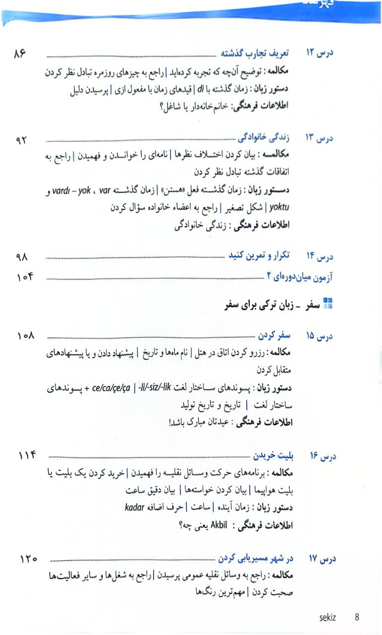 بخش «ترکی برای سفر» شامل مباحثی مثل رزرو هتل، خرید بلیت، پرسیدن مسیر، شناخت وسایل